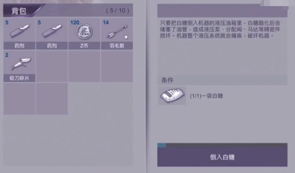 而且白糖的用途在游戏中至关重要。它不仅是完成琳任务的必需品,还能用于制作神器枪械,这对玩家在末日世界中的生存非常关键了。而且在任务中也需要将白糖投入挖掘机中,这样才能破坏蝗虫组织的邪恶计划,解锁独特的结局类型,所以说白糖合理使用,对于游戏的进程有着不可忽视的影响,大家一定要多多获取。