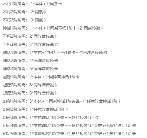 如果游戏里是普通角色,那么升阶材料比较简单。小编列出了普通角色所需材料:不朽1阶所需:1*本体+1*同系卡;不朽2阶所需:2*同系卡;不朽3阶所需:3*同系卡;神话1阶所需:1*本体+1*同系;不朽1阶卡+2*同系传说卡。