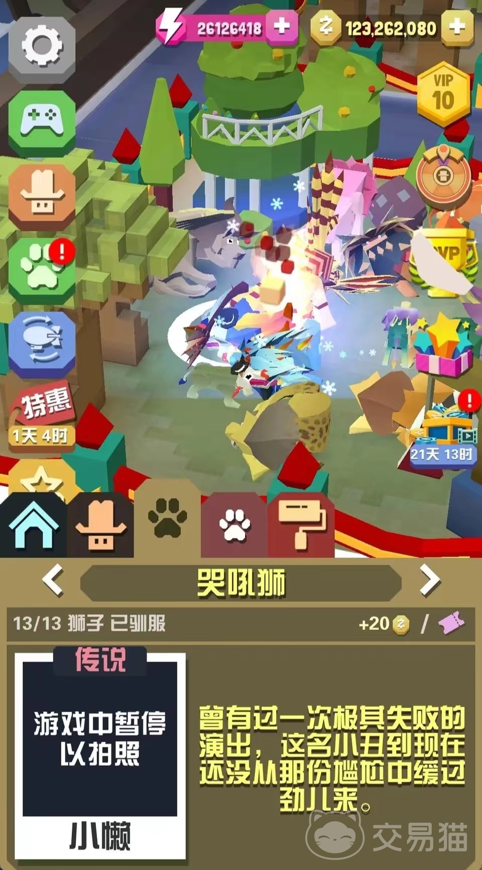 第八个是哭吼狮,想要获得哭吼狮,有两种方式,一种是直接让同一个狮子使用掉其他30个不同的动物,另一种方法是让玩家骑着不同的五头狮子,这样哭吼狮就会出现了。