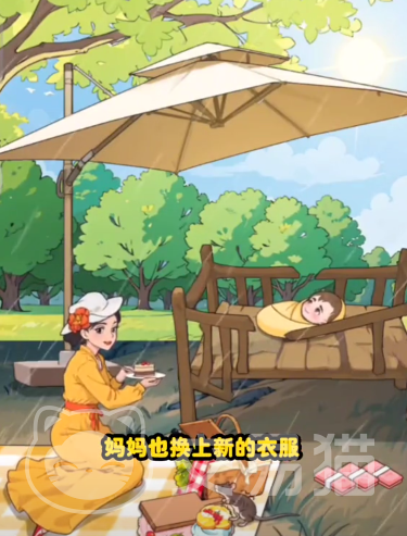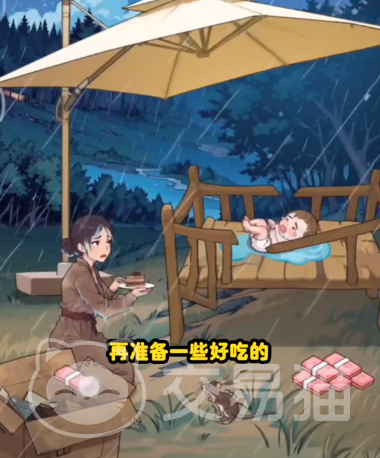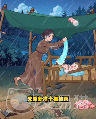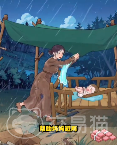 能看到画面上妈妈之外,还会有一个一直在哭的小孩子,这时候首先要架起雨伞给宝宝和妈妈遮雨,可以把一匝前拖到已经破洞的顶棚上,然后要准备一些食物,可以把一匝前拖到纸箱里,在这些食物里会有荷包蛋,需要把荷包蛋拖到天上,这时候就会从阴雨连绵的夜晚变成艳阳高照的晴天,这时候基本上这一关就已经完成了一半,可以继续用剩下的资金解决游戏里的困境。