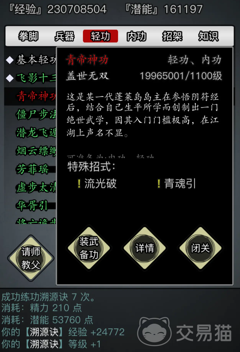 而拳脚的具体修行方法和前置任务都比较简单,像是石室、搬木材、坡道石壁、李崇虎等等,就不在本文赘述,可以参考其他攻略。而拳脚修行之中我们有几个小细节要注意一下:单一分支的锻境等级最高为500级。这是游戏中不断修炼和提升的目标。当达到这个等级时将获得更强大的能力和技能。而锻境满级时,你的武炼值将达到2300。武炼与伤害力之间的比值是10:1,也就是说,每增加10点武炼,你的面板伤害力将增加1点。直接关系到拳脚威力。