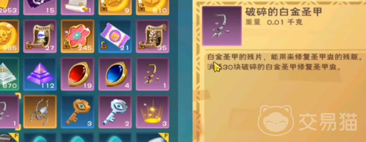 5、这里有两种材料给玩家选择,一种是破碎的白金圣甲一种是破碎的黄金圣甲,分别会修复出不同颜色的圣甲虫。都是消耗三十个破碎的圣甲完成修复圣甲虫的,点击使用就可以了 。