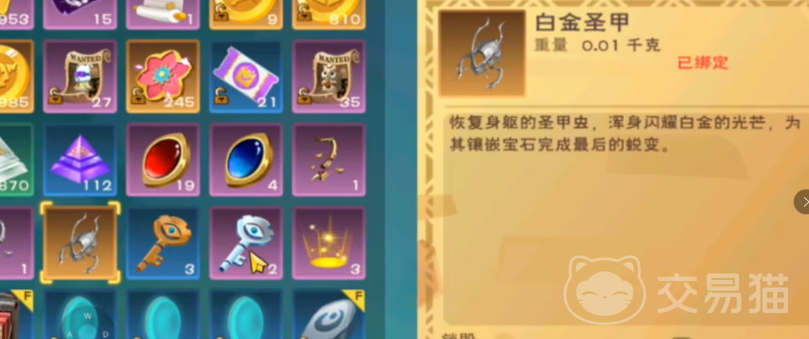 6、修复后,就会在白金圣甲上看到一串说明,恢复身躯的圣甲虫浑身闪耀白金光芒,为其镶嵌宝石,完成最后的蜕变。