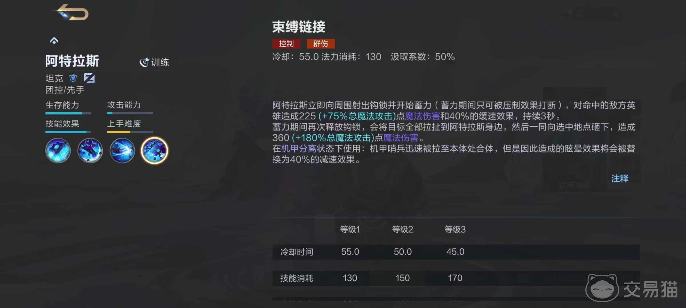 一技能向地面锤击,造成连续三次伤害,如果在机甲分离状态下使用,本体和机甲都会释放该技能。第2个效果是阿特拉斯可以将机甲进行分离,本体提高移动速度并免疫减速,机甲则会跟随本体移动,靠近后双方会再次合体,当机甲分离状态下时,阿特拉斯和机甲共享生命值并降低受到的伤害。大招效果是将手中勾锁发射出去,并开始蓄力,命中敌方英雄后造成魔法伤害加减速效果。在蓄力期间可以再次点击释放钩锁,将目标拉扯到身边,如果在机甲分离状态下使用,机甲将会被立即拉到本体处。