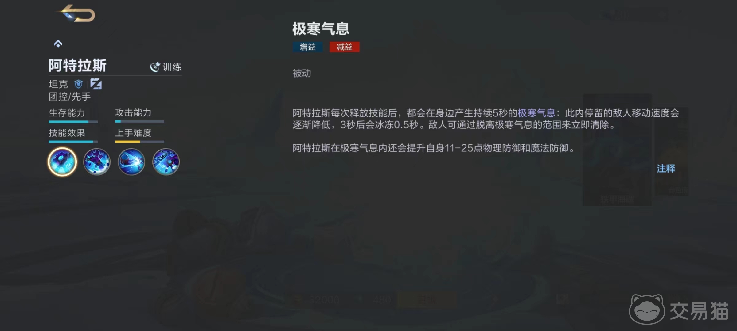 阿特拉斯不并不属于那些无脑往上冲的肉盾角色,而是具有一定的上手难度。被动效果是每次释放技能后,身边都会产生极寒气息,持续5秒钟。凡是在范围内的敌人都会降低移动速度,如果持续承受三秒钟将会被冰冻起来,当敌人脱离后会立即清除。阿特拉斯本体在极寒气息内提升自身物理和魔法防御,所以阿特拉斯需要尽量冲进人数多的地方释放技能,进而影响更多敌人。