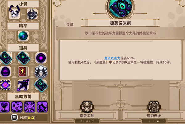 恶魔集这个装备在游戏中的翻译叫做德莫诺米康,完全就是音译了,原名是Demonomicon。首先它可以给我们带来60%的法术攻击强化,也就是说在使用魔法武器或者是魔法技能的时候可以直接带来一定的魔法攻击力伤害提升。