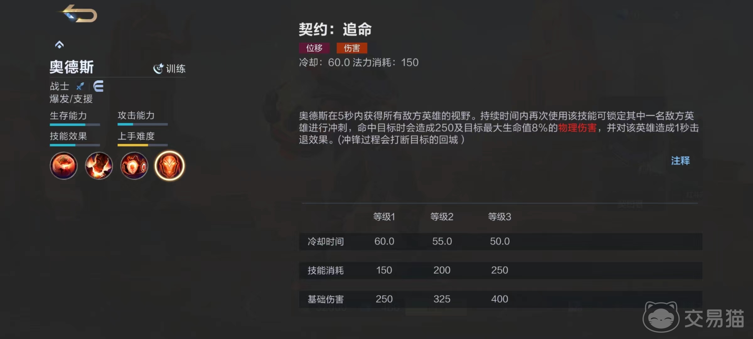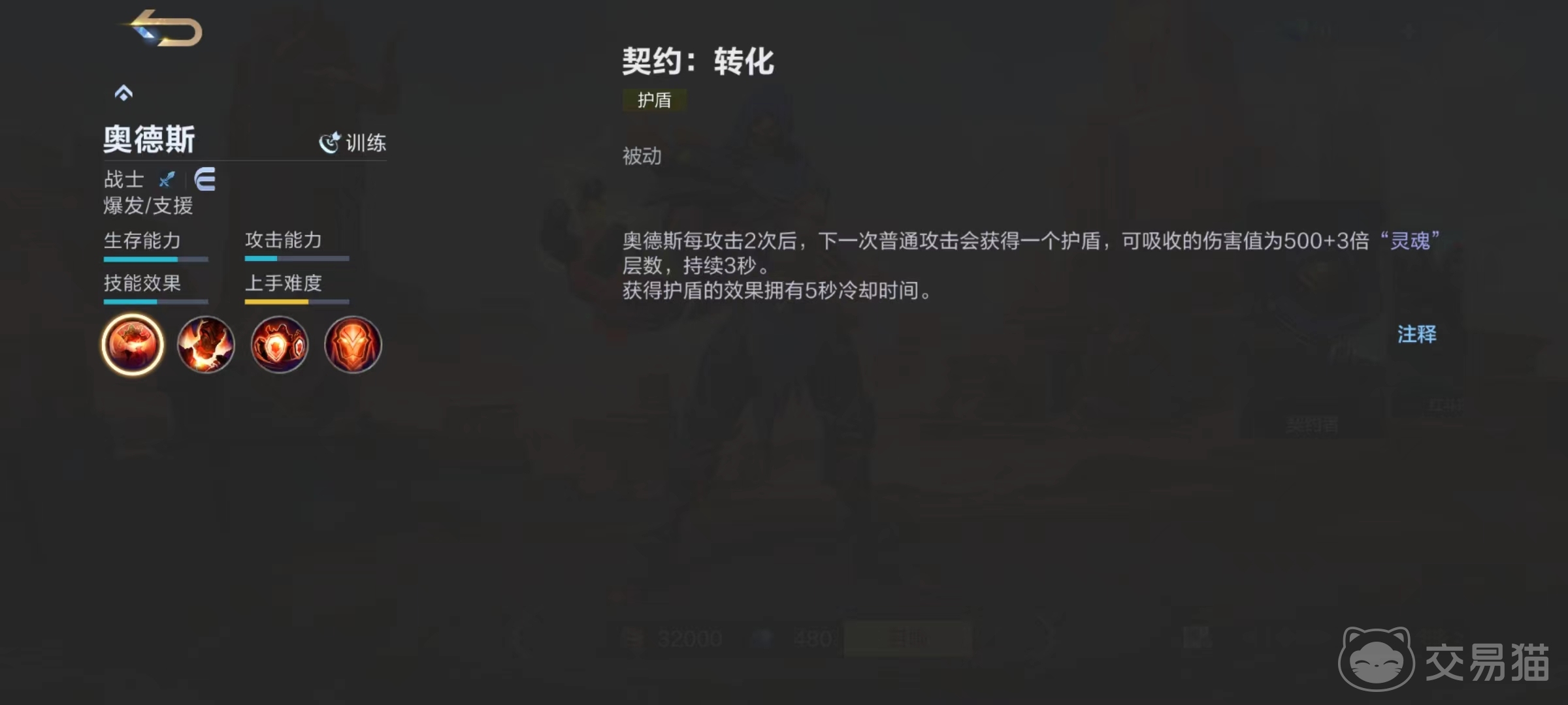 奥德斯在每攻击两次后,下一次普攻都将获得一个护盾。一技能强化自身下一次打出的普攻效果,如果利用该次普攻击败敌方单位,自身将叠加两层灵魂效果。每层灵魂效果能提升该技能额外伤害,而且是永久提升,这一点叠加起来是很致命的。在二技能开启后自身受到伤害大幅度减少,并增加移动速度,持续两秒钟。当技能自动结束或者是手动点击解除时,都会将周围敌人眩晕并造成伤害。