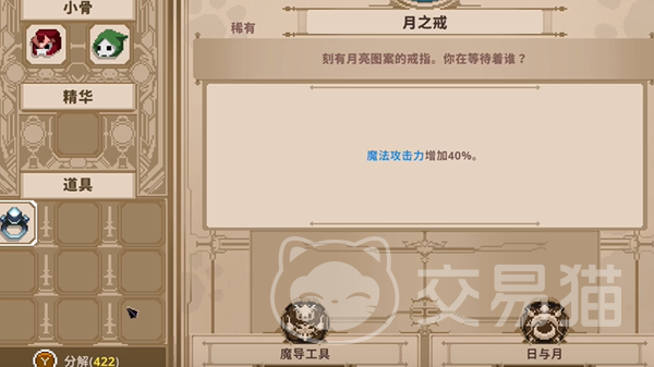 月之戒(Lunar Ring)的效果是能够增加我们40%的魔法攻击力,如果使用一些类似法杖的魔法类武器,或者是使用一些AP技能就能够获得输出提升的效果。这两个装备如果同时存在于我们的背包之中,就会自动进行融合并且促成日与月效果,也就是合成为【灿烂黎明】这个装备。
