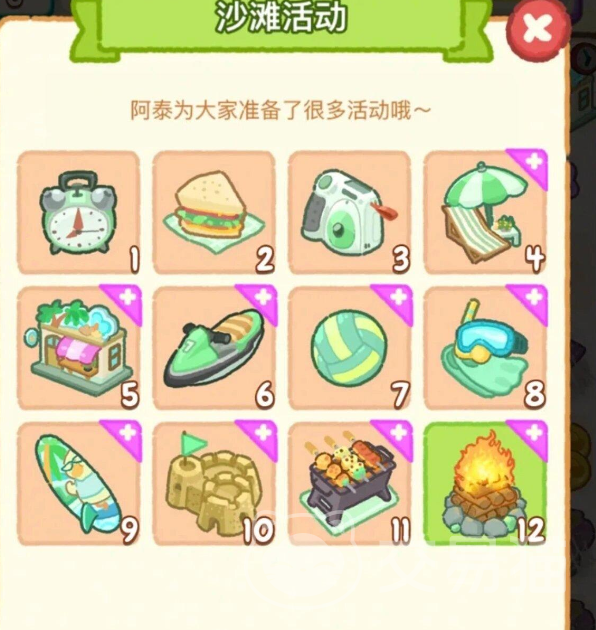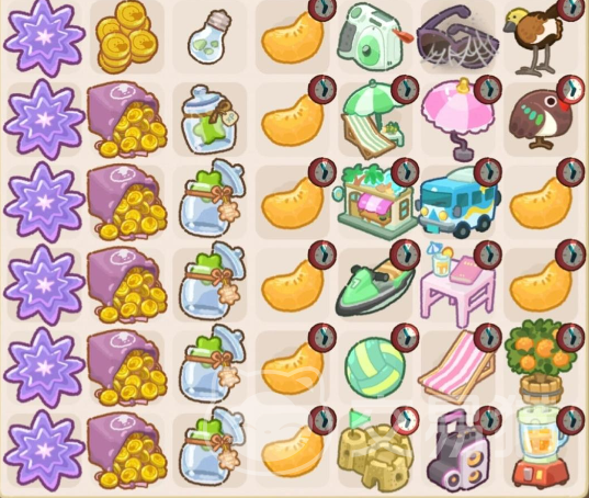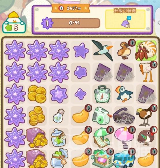 玩家有自带行李箱,箱子会根据不同等级产出不一样的道具,其中2到5级全部产出防晒霜,5级以后便会产出遮阳伞,这个道具很关键,是产出沙滩活动的紫星星,也是通关的要求。