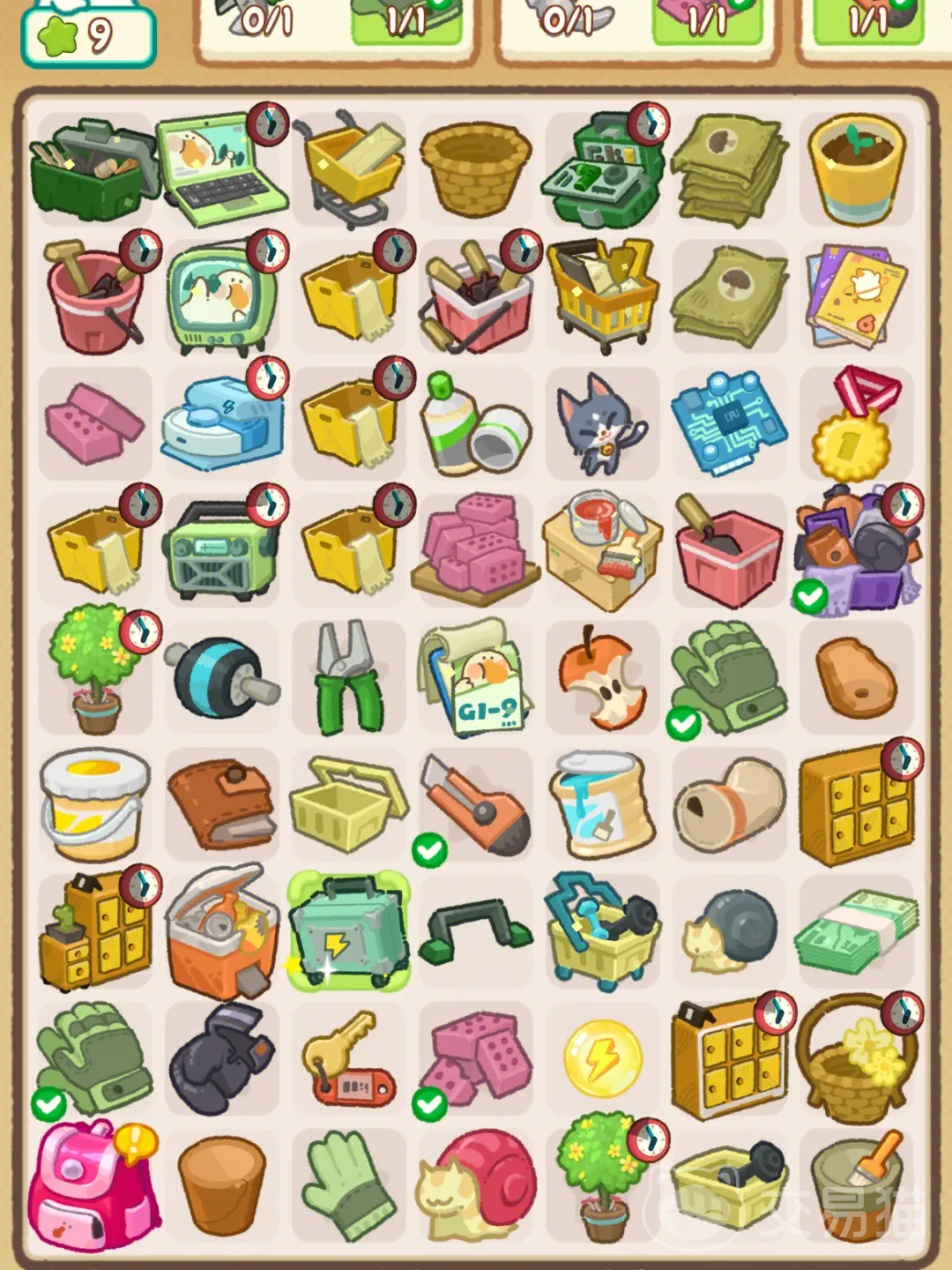 在大扫除之前玩家需要准备1个3级装修手套以及3个大垃圾袋,首先需要打扫柜子,需要使用到垃圾袋2级,顺便准备一下创可贴1级,以免后续受伤无法进行打扫。