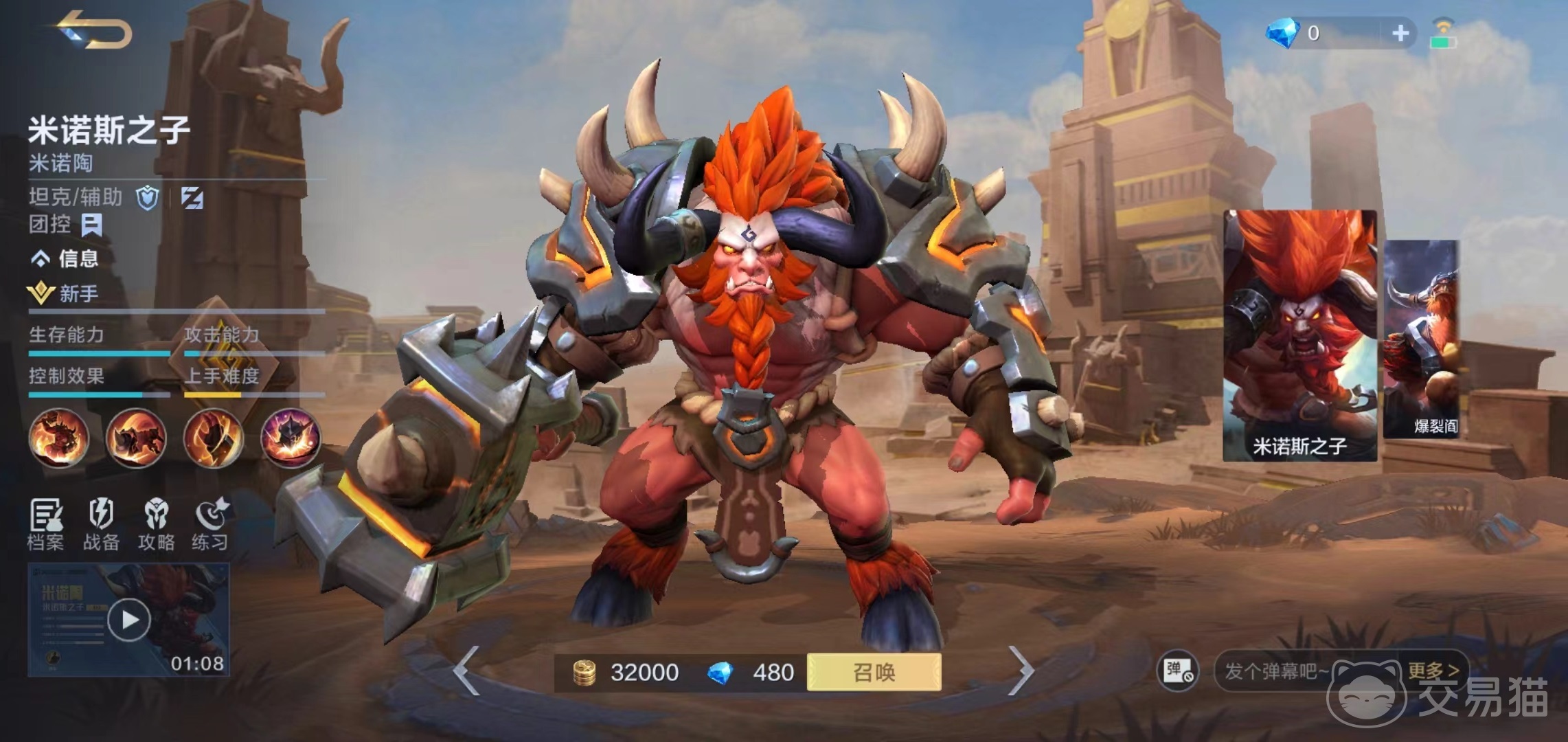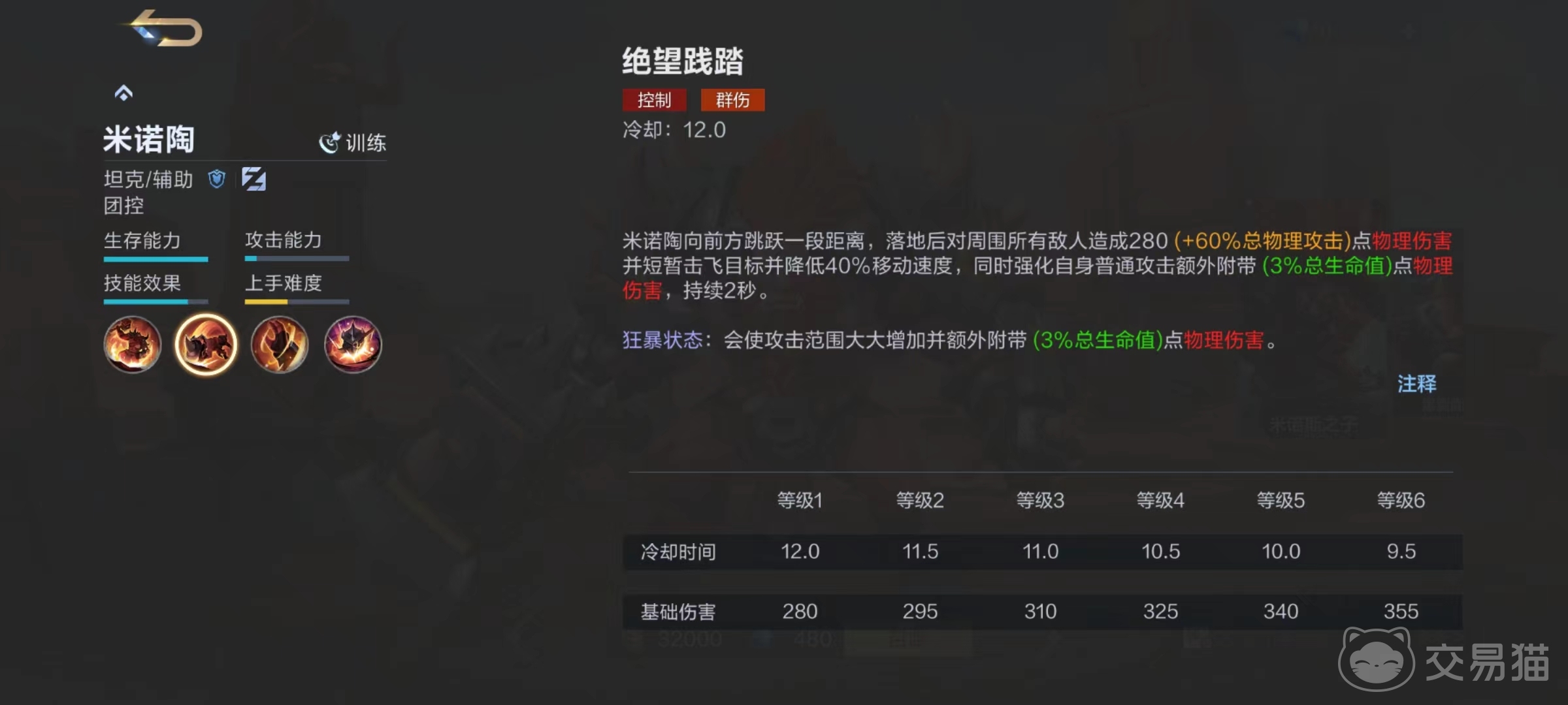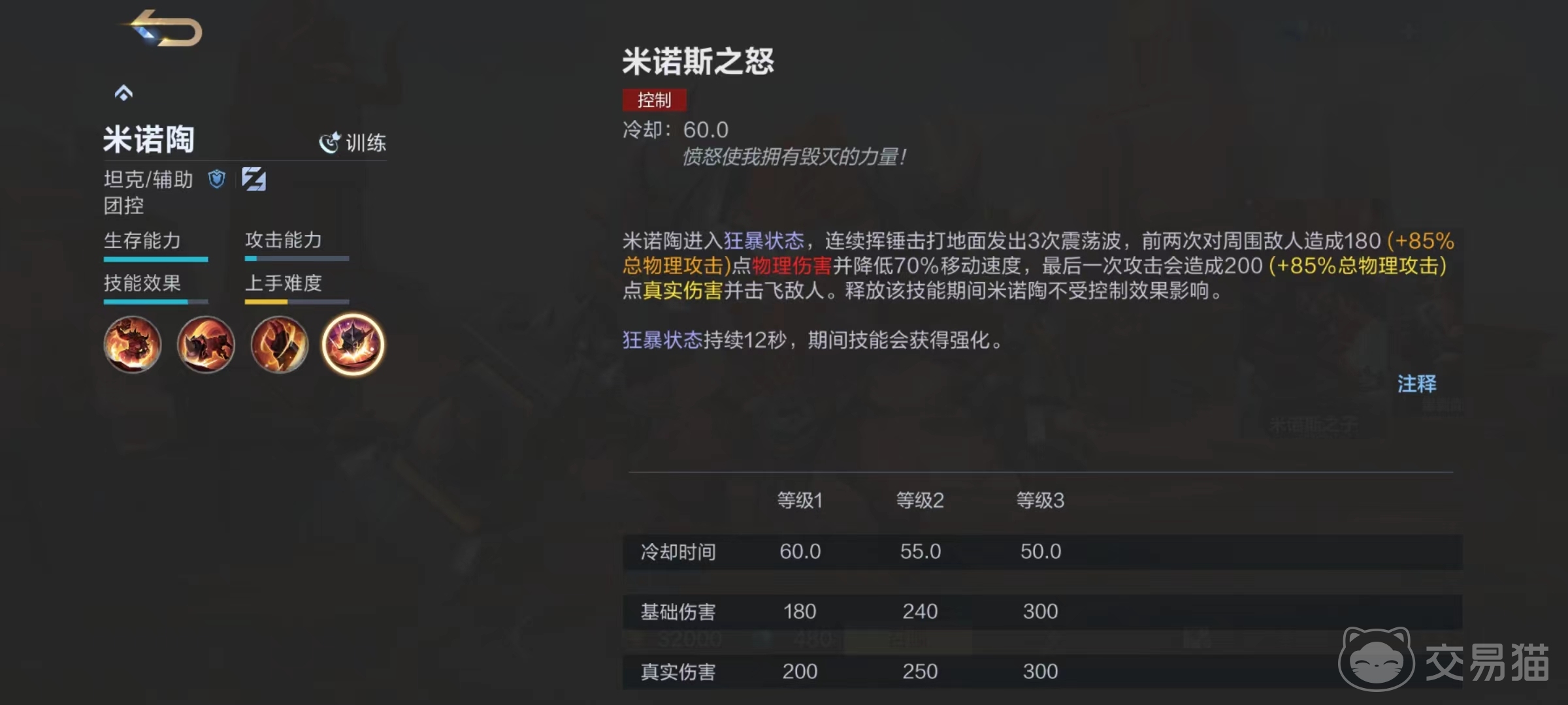 米诺陶在生存能力方面非常优秀,攻击敌方或者受到伤害时都会叠加怒气,当怒气达到满值时,可以通过强化自身三技能来进入狂暴状态。在此状态下攻击、防御力都有加成,当狂暴状态消退时,米诺陶短暂时间内无法获得怒气和使用米诺斯之怒技能。一技能向前方跳跃,落地后对附近敌人造成击飞和伤害,同时降低伤害目标攻速和移动速度,还能在接下来提高普攻伤害,如果是狂暴状态下攻击范围增大,伤害提升。