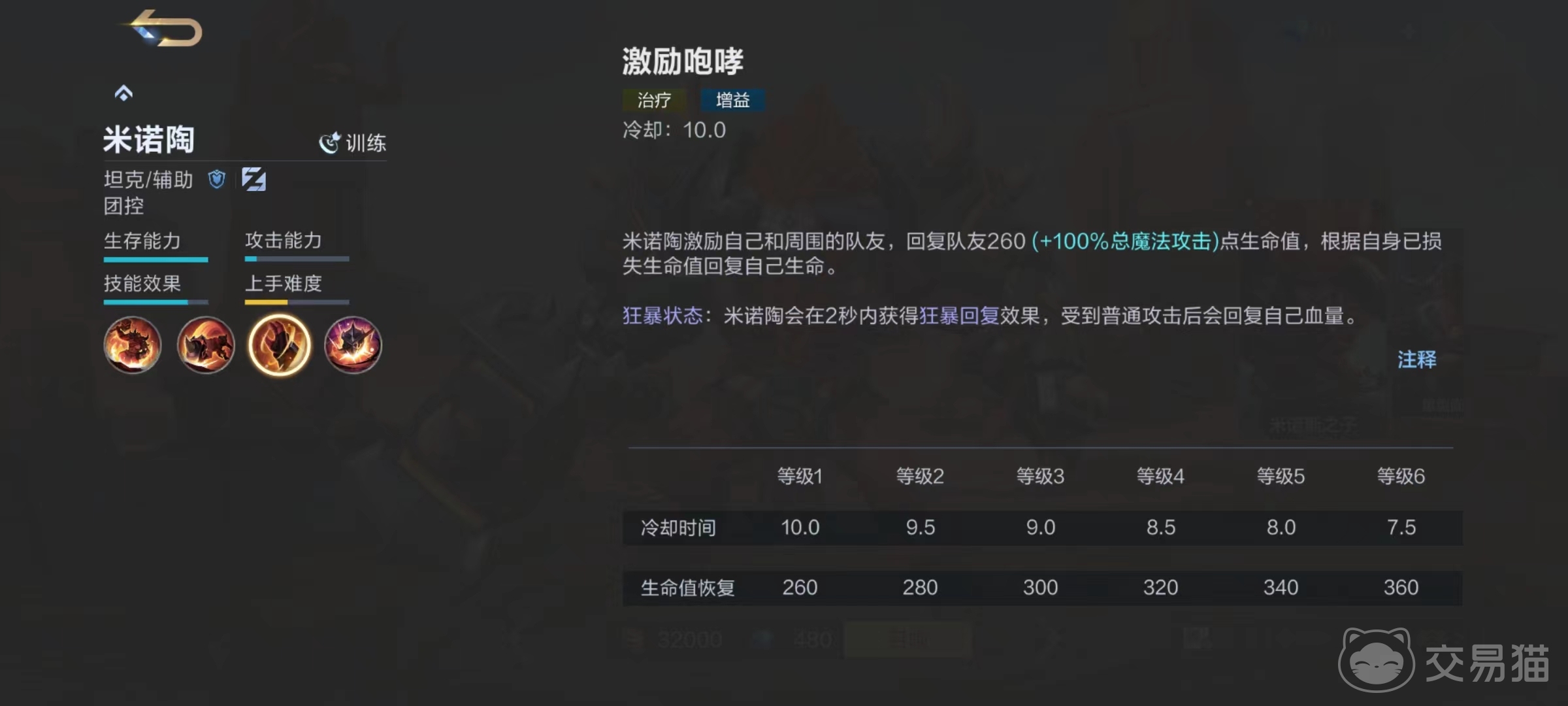 二技能使用后为自身和周围队友恢复体力值,短时间内提高己方攻速,狂暴状态下米洛陶将会获得狂暴恢复效果,受到普攻后恢复自身血量。三技能开启后,进入怒气积攒状态持续获得怒气,在满怒状态下使用该技能直接进入狂暴状态,还会连续攻击地面三次。前两次附加伤害及减速,最后一次直接将敌人击飞,在狂暴期间还不会受到控制效果影响。