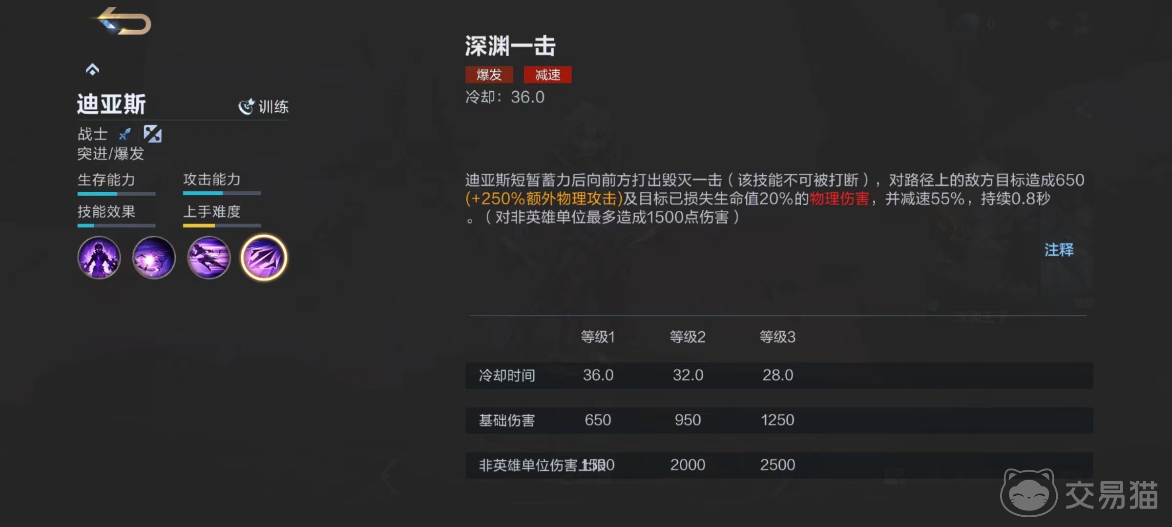每进行两次普攻之后,第三次普攻就会造成额外范围伤害,并为自身恢复生命值,通过普攻和技能命中敌人时获得怒气,每50%怒气值都可以强化一次技能。所以通过普攻来消耗对方以及积攒怒气,是打出迪亚斯连招的关键方面。一技能指定方向后打出爆裂之击,将目标减速。二技能突进撞到目标后停下来,再次使用该技能会锁定目标,造成伤害与减速,大招需要蓄力后释放,对前方路径上的敌人造成伤害和减速。