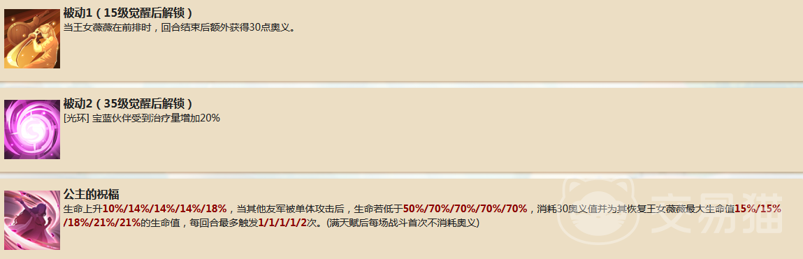 另外还有三个被动效果,第1个需要在15级时觉醒后解锁,当该卡牌被放到前排时,回合结束可以获得额外30点奥义。被动二技能35级觉醒时解锁,宝蓝伙伴受到治疗量增加30%,属于光环类型。最后一个是公主的祝福,生命值上升,当其他友军被单体攻击时,如果生命值过低则消耗奥义值为其恢复生命值,每回合最多触发两次。