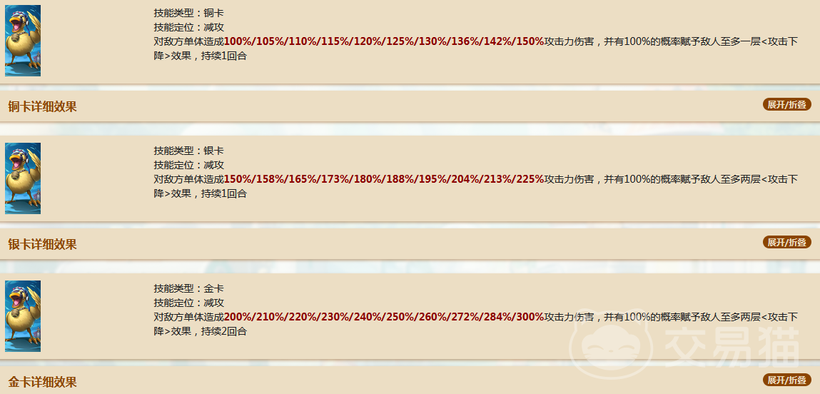 黑鸭冲锋选定敌方单体后造成伤害,并有100%几率为敌人添加一层攻击下降效果,持续一回合。当达到金卡时,造成的伤害提升,赋予的攻击下降最多达到两层,这对于限制对方输出也是很有帮助的。友情召唤是为我方全体角色附加攻击上升效果,持续两个回合,并且回复一点行动力。