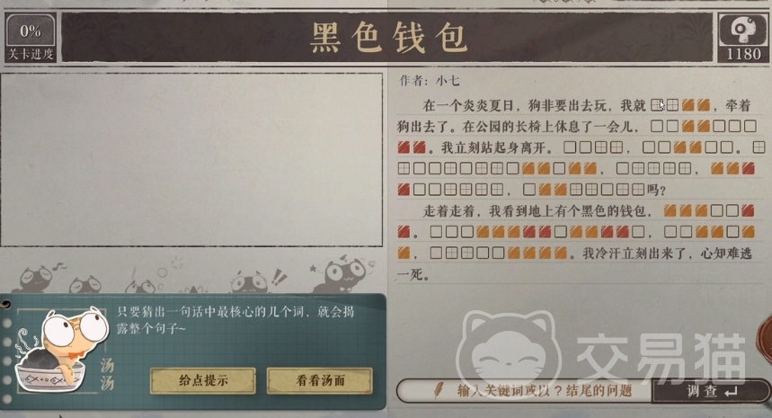 之前为大家介绍的海龟蘑菇汤中大家是不是看到了很多的难题呢?这款游戏大家需要通过简短的信息来填写完整整个故事,所以很多关卡当中的细节大家挖不出来,本期带来了海龟蘑菇汤黑色钱包怎么过的介绍,其实这个关卡的背景故事很简单,但是大家想要通关也不是那么简单的。