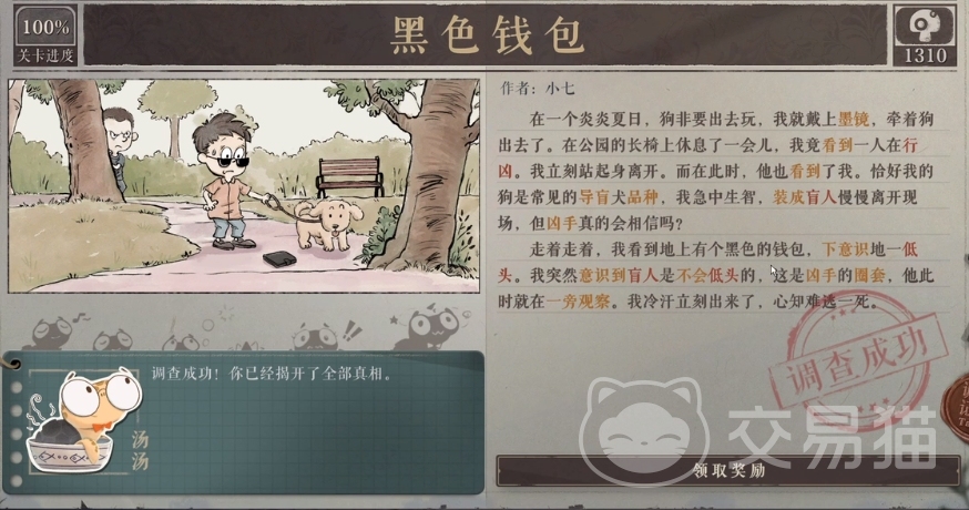 在故事背景当中主角牵着狗出去逛公园,在公园长椅上面休息一下就离开了,但是在地上看见一个黑色钱包之后就知道自己大难临头,这里大家能够得到的信息不多,首先大家是需要判断出来,这里大家欠着的狗是一个重点,而且黑色钱包是重点。