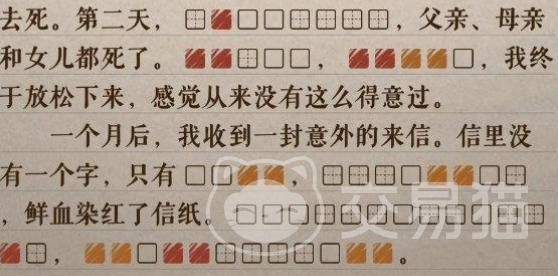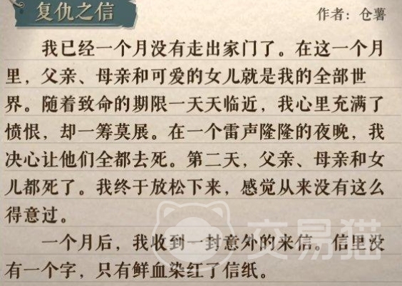 在背景剧情中主角有父母以及女儿,一个月没有出门是因为心情不好,但是一开始就有一个致命的期限在威胁着主角,在一个有雷声的晚上主角想让自己的父母以及女儿都死掉,随后第二天确实父母以及女儿都死掉了,主角的心情也放松了但是过了一个月主角自己收到了一封带有血的信。