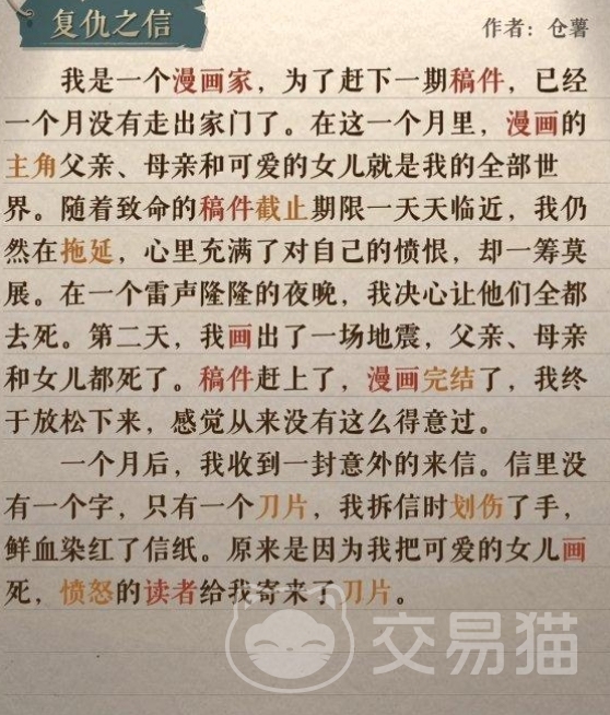 在这里大家是可以找到几个关键的线索,比如说一个月没有出门,那么主角的工作是什么,而自己的父母跟女儿为什么说死掉就死掉,确定是亲生的吗?这里的致命期限是什么?其实大家通过这三个线索就可以得出原来主角是一个漫画家。