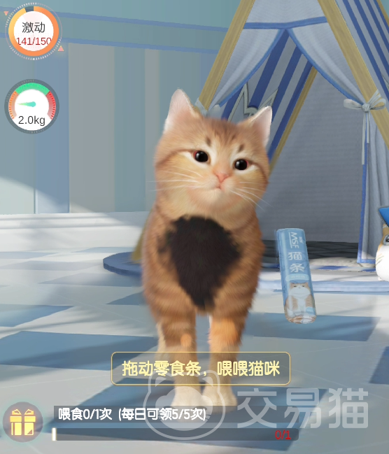 我们前期给猫咪的食物只有普通的猫条,我们在选择好猫条之后,记得拖拽给猫咪来进行喂食。这里有一个小技巧,在每日第一次给猫咪进行喂食的时候,是可以领取到投食奖励的。之后我们点击返回,然后回到和猫咪之间的交互界面,我们选择给猫咪来进行送礼。