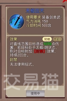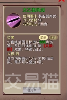 太乙御风剑:需要装备剑类武器才能使用的一门武学,相比拳掌武学来说它的伤害和范围都要高出一个档次,可以对一条直线的目标造成935点伤害,同时还能附加一层太极阴效果以此降低目标此后的输出,并且这个效果施加后可以持续足足三回合,期间继续施加的话还能够不断叠加,配合武当系的其他一些武学会非常有用。