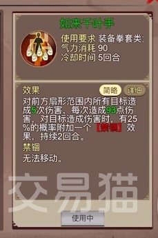 如来千叶手:这一武学属于一种拳掌类武学,能够对前方扇形范围的目标造成五次伤害,不仅伤害频率很高,而且它属于是一个不带衰减效果的AOE伤害,并且伤害目标的同时还有一定几率能够施加两回合禁锢,所以它可以说是一个兼具群体输出和控制能力的强力武学,并且由于品质是绿色,所以获取起来也很容易。