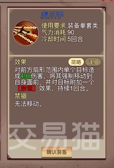 虎爪手:这是比千叶手要高一级品质的一个蓝色武学,它同样也是拳掌武学,只需要有拳套装备上便可以使用,其效果是造成490的单体伤害,范围与千叶手差不多,不过伤害明显要高得多,而且需要注意的是它的伤害是瞬发的,所以爆发肯定也是要更强的,此外,这招还附带了一个强制位移效果,此后也同样能为目标施加一回合的禁锢。