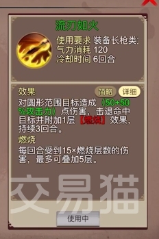 流刃如火:非常经典的一个长枪类武学,虽然是绿色武学但气力消耗却高达120,而它的效果也确实能够匹配得上这份气力消耗,能够对圆形范围内的目标造成50+50%攻击力的伤害,也就是说越到后期,它的伤害就会越高,同时它还有击退目标和对目标附加一层燃烧的效果,这个燃烧效果能够在后续三回合每回合都造成一定伤害,并且伤害还能够随着燃烧层数的叠加而提升!