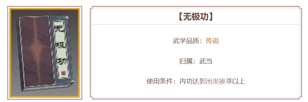 无极功:出自武当的一门传说心法,内含太上无极和神门太乙两个技能,前者有一定几率给目标施加太极阴和阳两种状态,两种状态下敌人均会受到一定的减益,此外,配合神门太乙,角色在对抗有这两种状态的敌人时,还可以对它造成额外30%的伤害。