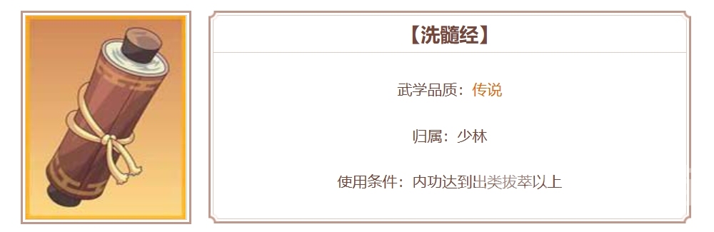 洗髓经:这一心法出自少林,品质属于传说,其自带了两个技能效果,第一个技能是天罡功,在等级1时可以激活,效果为每次受到伤害时有一定几率能够为自身加盾,这个盾可以吸收大量伤害,极大的提升了角色的承伤能力。