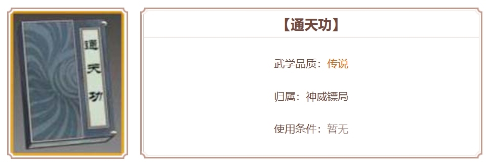 通天功:这是出自神威镖局的一门传说级别的心法,它内含两门对应的武学技能,第一个是逍遥诀,能够让自身在使用后获得真武和20%的远攻效果,两个效果均能大大提升角色的战力,前者能够让角色武器的不可攻击范围被解除,后者则能够增加角色的攻击距离,相当于能够打到比原先更远的地方。