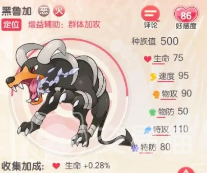 第三个精灵是黑鲁加,这是一个恶系的精灵,有诡计也是非常普通的事情,作为一只可以辅助的精灵一般是被放在队伍的最前排替队友抵挡伤害,同时这个精灵的被动也非常好用可以给队伍中的精灵加上攻击力,即使是面对对面有神兽这样的情况,就算自己没有办法进行输出,也可以给队友先带来收益后再下场。