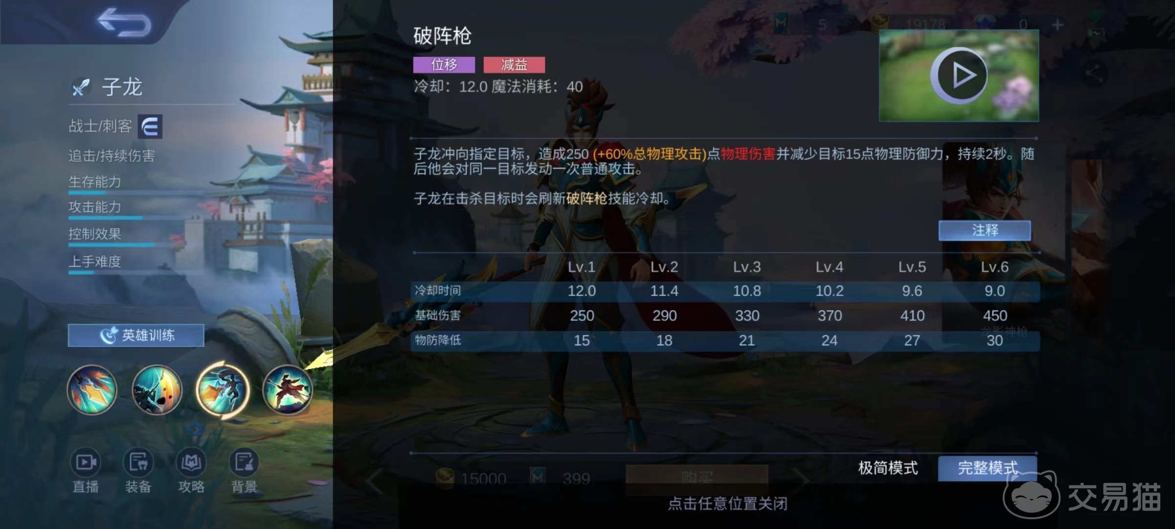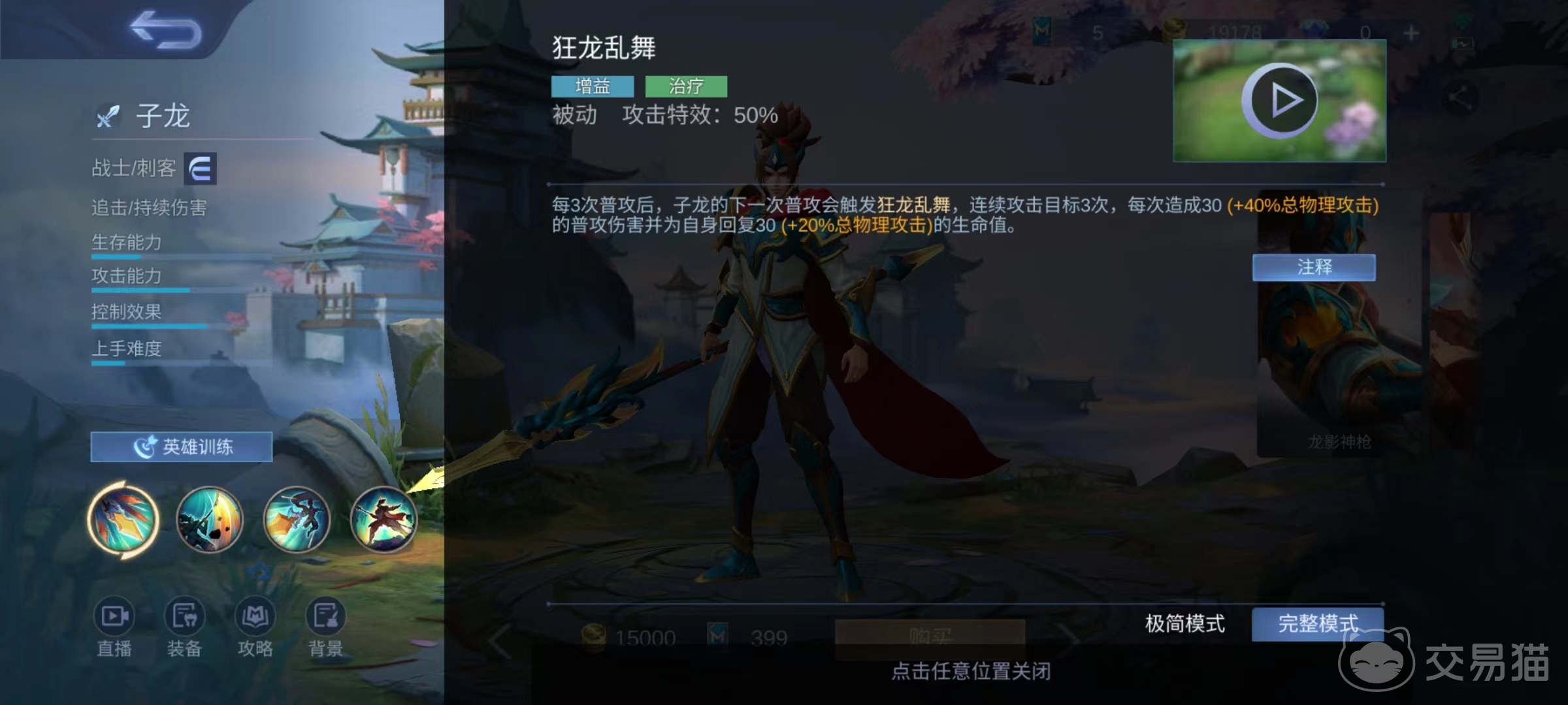 在该英雄被动影响下,每进行三次普攻,下一次普攻就会获得强化效果,攻击时触发狂龙乱舞,能连续攻击目标三次,每次造成伤害后还会恢复自身生命值。这也是子龙可以进行打野的保障,实现无伤快速清野怪,后期依靠普攻打出伤害也是必修课。一技能将敌人挑飞到背后造成物理伤害。