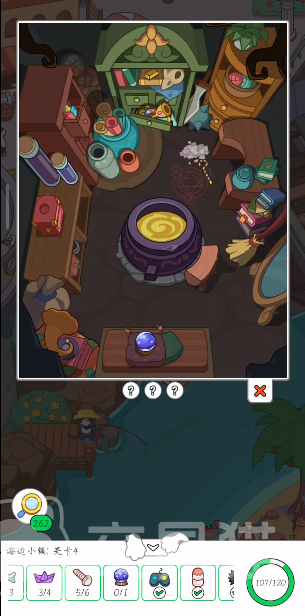 海边小镇的关卡较多,其中关卡二海边的小屋需要玩家亲自操作较多步骤:首先点击桌面上的瓶塞,将造好的汤倒入瓶中,并用木塞塞住。然后用针线缝好桌子上的魔法帽,然后掀起铁头盔拿底下金钥匙,开最下方有钥匙孔的柜子就能进入关卡三。