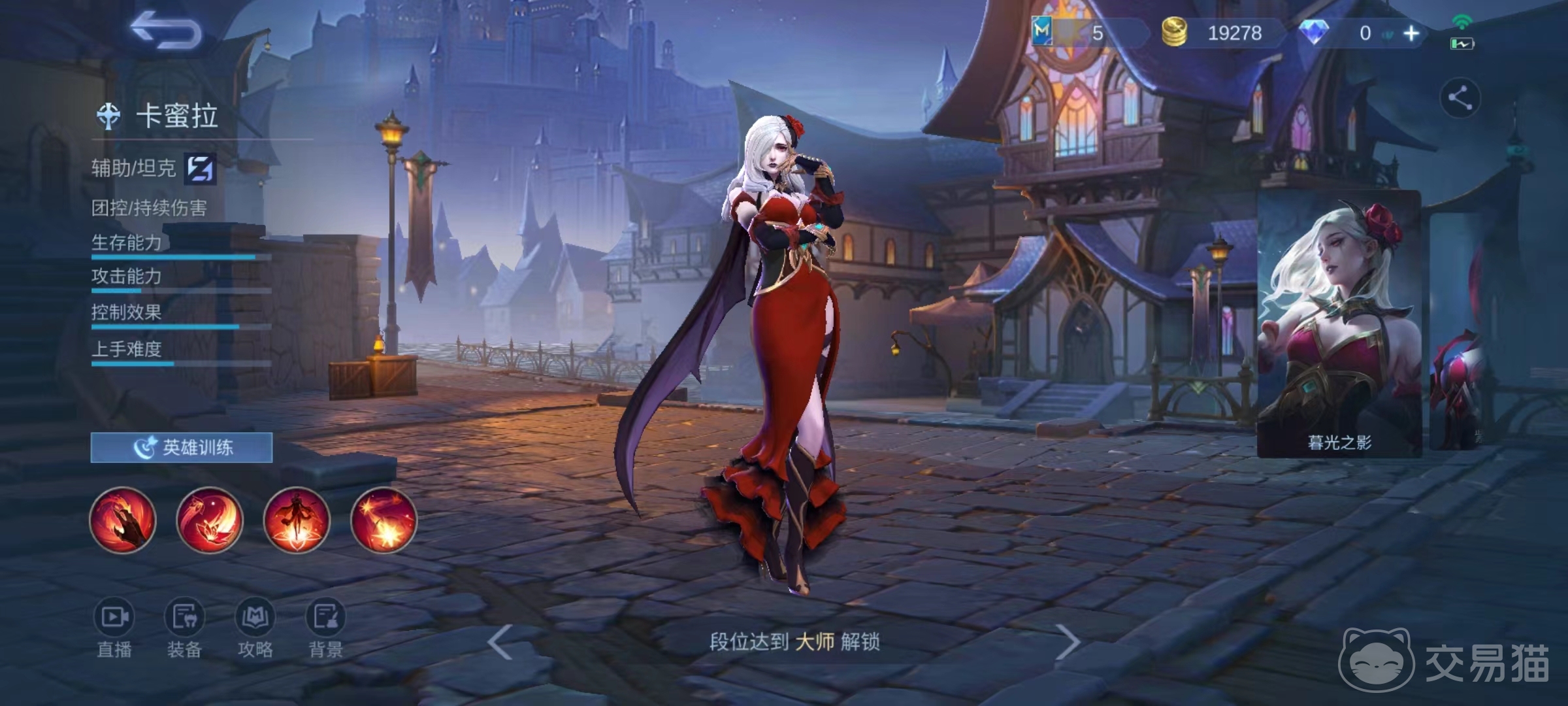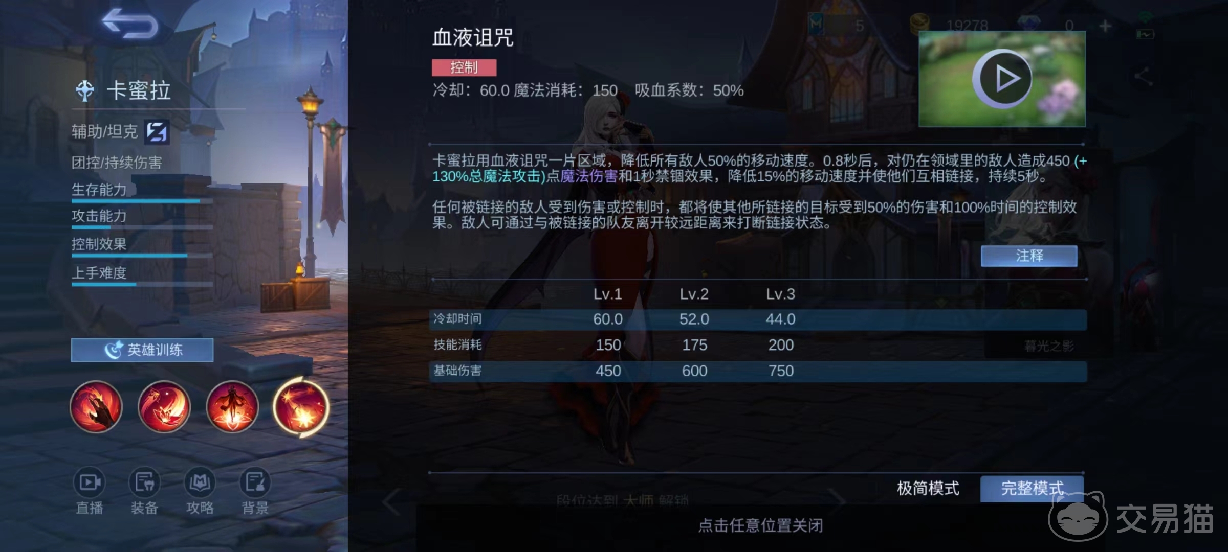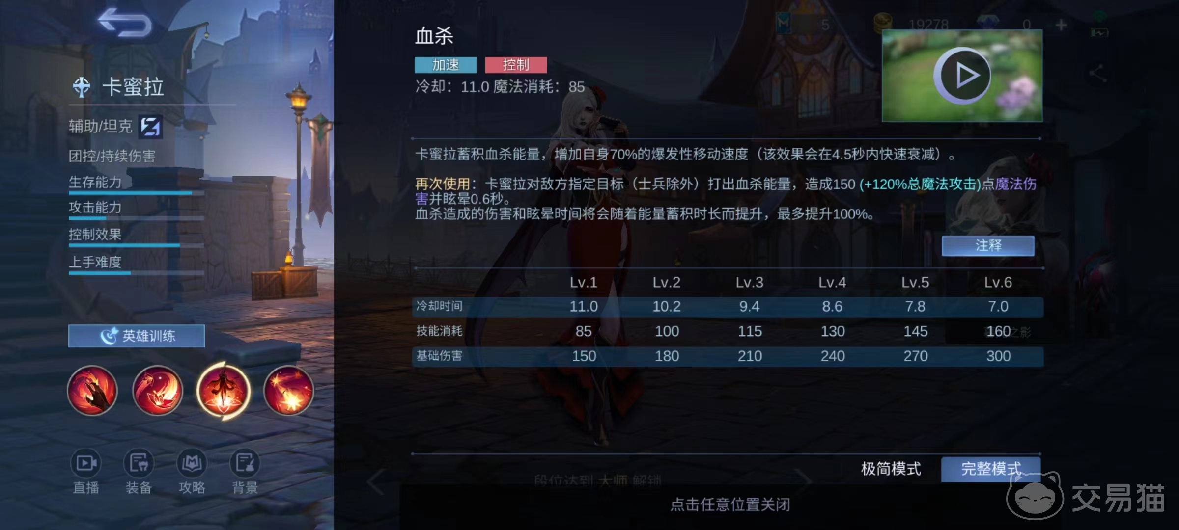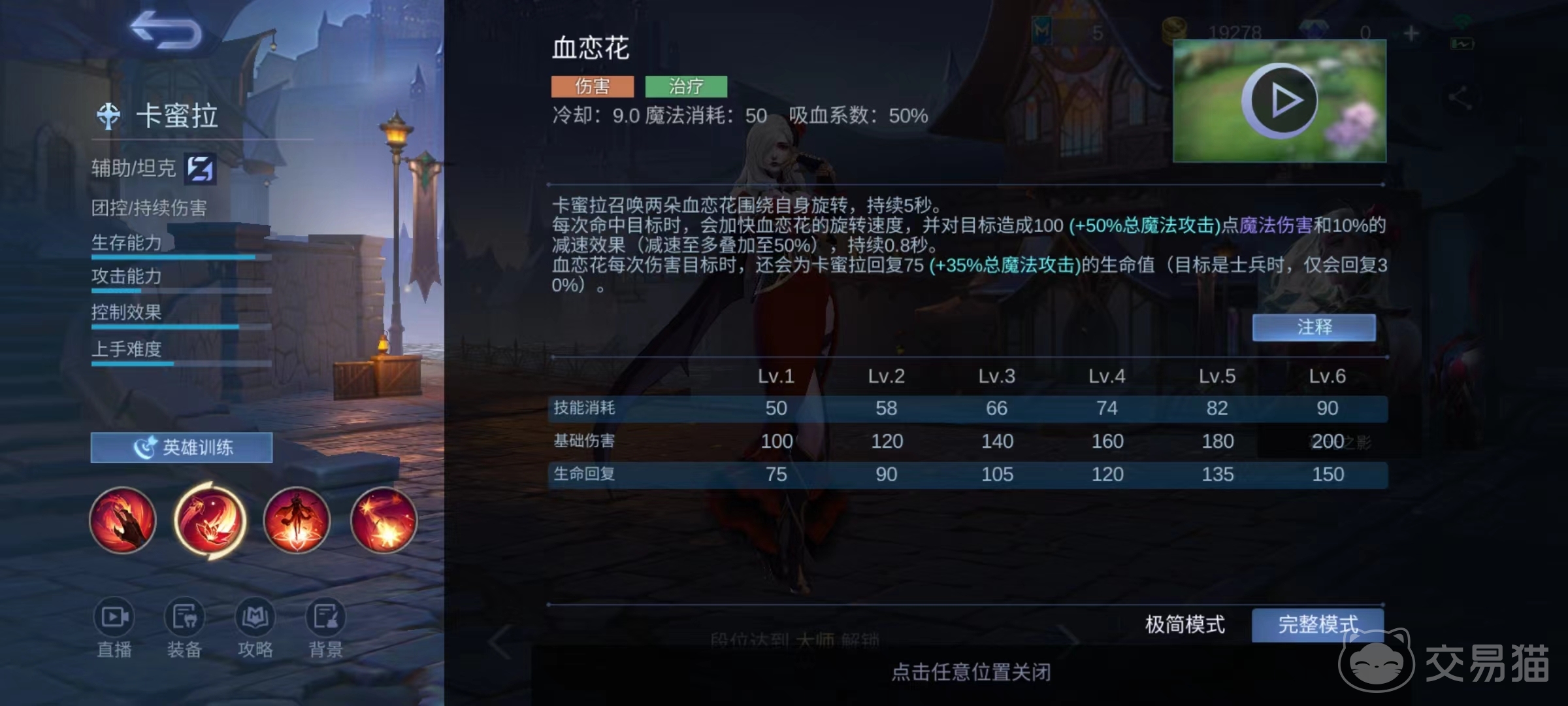 一技能血恋花,召唤出两朵血恋花围绕自身旋转,持续5秒钟,每次命中目标都会加快旋转速度,造成魔法伤害和减速效果,另外在血恋花每次伤害目标时还会为卡蜜拉恢复血量。二技能需要卡蜜拉先积蓄血杀能量,增加自身移动速度,再次点击使用对敌方指定目标打出能量,造成魔法伤害和眩晕,此技能伤害将会随着能量积蓄时长而提升。大招血液诅咒。开辟出一片区域,所有敌人在区域内都会降低移动速度,如果敌方在0.8秒钟之后依然在区域之内,则会受到高额魔法伤害加禁锢效果。还能使它们相互连接起来,连接效果是任何被连接的敌人受到伤害或控制,都会使其他被连接目标同样受到伤害和控制,敌人可以通过远离来打断连接状态。