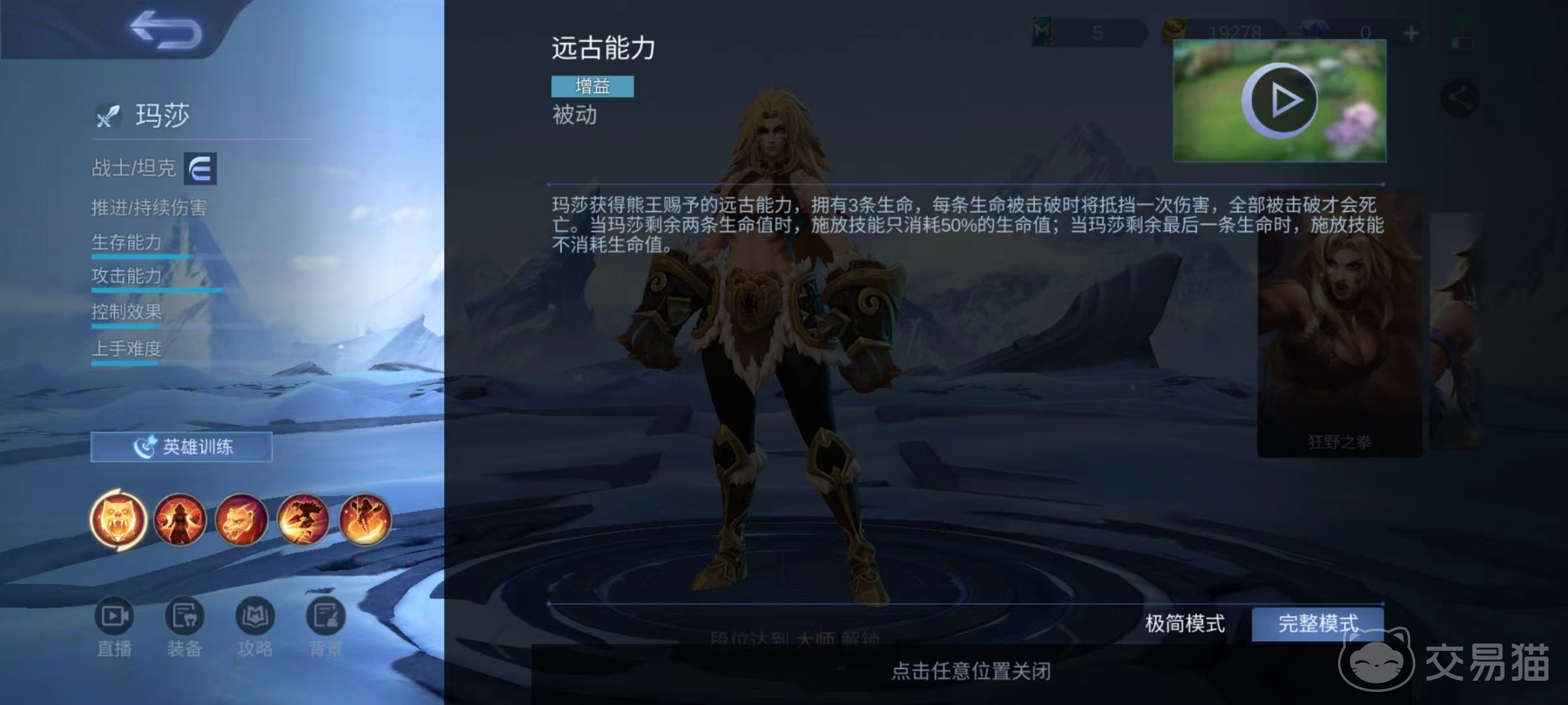 玛莎的被动使他能获得熊王赐予的远古能力,拥有三条生命,每条生命在被击破时可以抵挡一次伤害,只有将三条生命全部击破才会死亡。另外当玛莎只剩两条生命的时候,每次释放技能会只消耗50%生命值,当最后只剩一条生命时,释放技能不消耗生命值。所以大家不用害怕玛莎血条比较长,实际上很多技能都需要消耗血量。