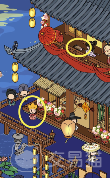 房间里边的草帽是可以直接点击的,然后到二层阳台上边去获取古筝和一楼门口的人物,另外在二层灯笼和古树的旁边都会有道具。房间左侧的竹书还有小桥下方藏在水中的纸船,