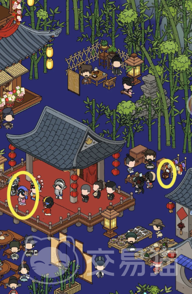 花盆旁边绿色青苔以及女人手里边拿着的物品,空中离月亮最近的那只小白鸽,桌子上的小铲子,戏台中间的那个人,道具间摆放的盒子,大树上被标记的东西,左侧桌子上的青菜,右侧女人手里边拿的包子也是。最后就是竹子,码头边上的小铲和盒子。
