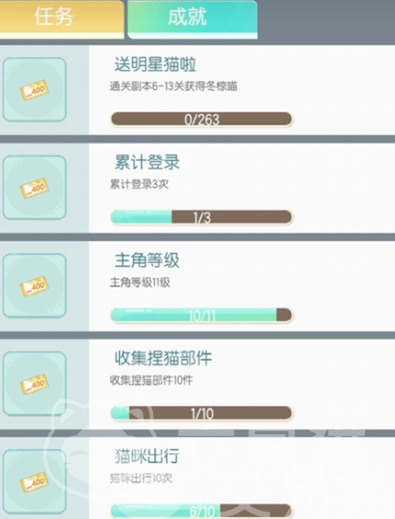 游戏中有主线任务及支线任务,在体力足够的情况下一定要完成,这样能够获得大量奖励以及资源和道具。此外还有副本,完成副本任务,也可获得较多材料,比如猫草以及猫毛,这些都是装修房屋必不可少的材料,装修房屋之后,猫咪的健康值有所提升,品级也会有所增加。