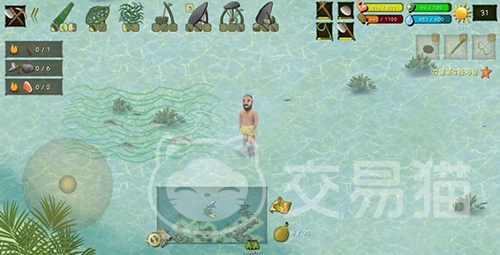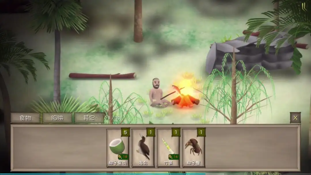 以上两个问题解决完之后,接下来肯定就是解决饥饿问题了,住的喝的都有了,但是角色是会饥饿的,需要吃东西,所以食物的问题也需要解决,椰子虽然可以回复一定的体力,但是毕竟杯水车薪。在前期阶段的时候,可以在出生海滩的附近,这里有浅水区,在这里可以去搜集一些贝类和海草当中食物,这两种东西的收集不需要借助工具,可以多准备一些,带回去之后可以进行制作,所以可以直接在避难所的旁边搭建一个生火点,之后用石头围起来,这样火源就能维持比较长的时间了。