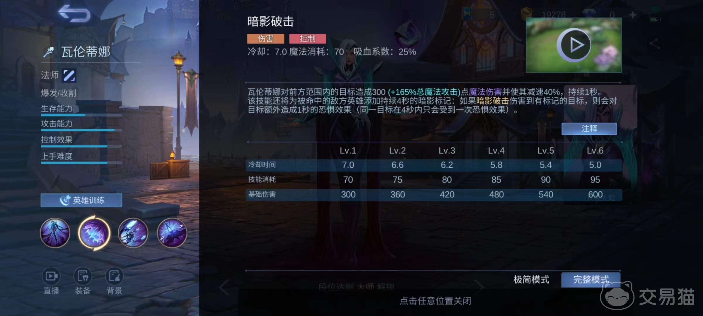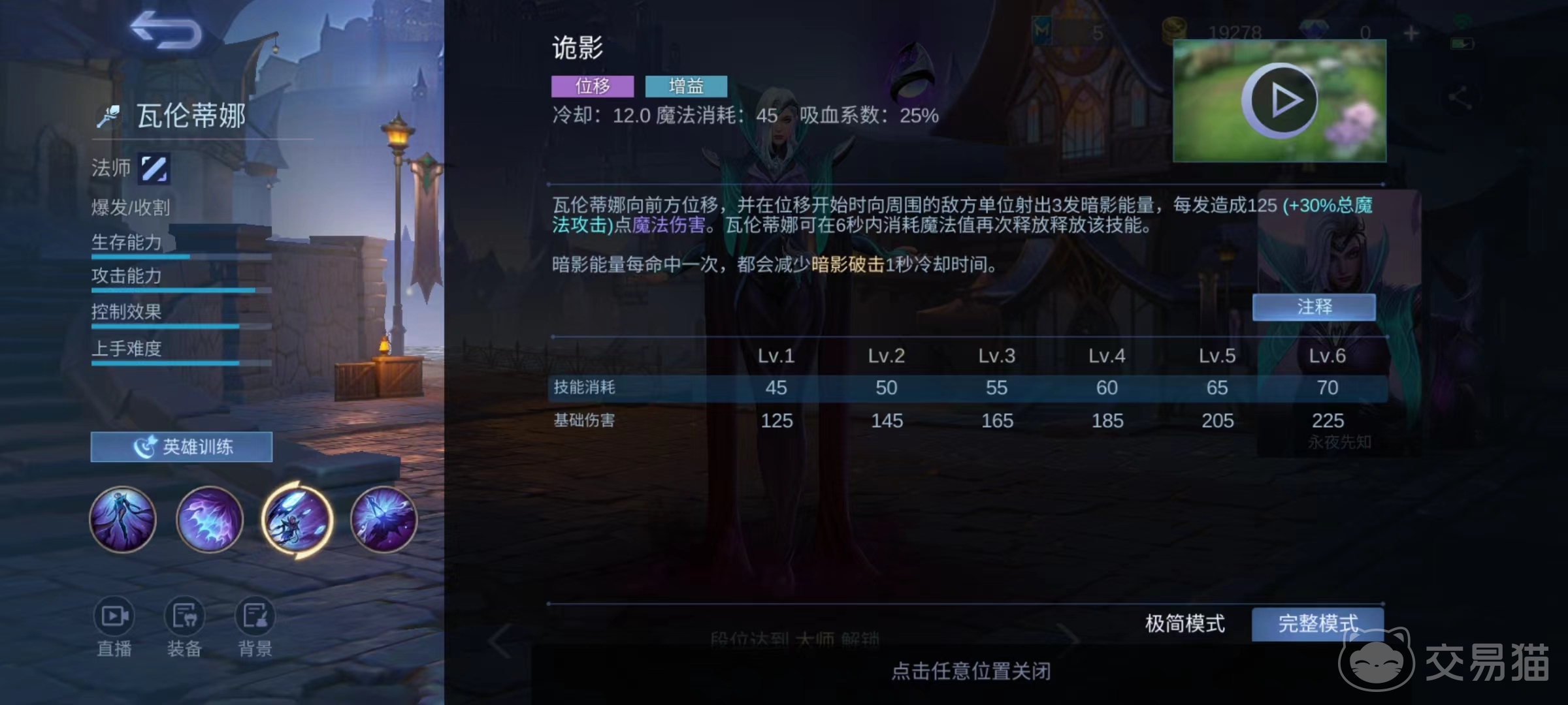 一技能对前方目标造成魔法伤害并附加减速,还会对被命中的敌方英雄添加印记,如果技能伤害到了有标记的目标,会造成额外恐惧效果。二技能向前方位移,在位移开始就向周围发射暗影能量,造成魔法伤害,还可以在6秒内消耗魔法值再次释放该技能。释放出的能量每命中一次都会减少一技能冷却时间。1、2技能组成小连招在线上消耗能力极强,如果能够准确释放让暗影能量尽量多的命中,一技能可以频繁释放。