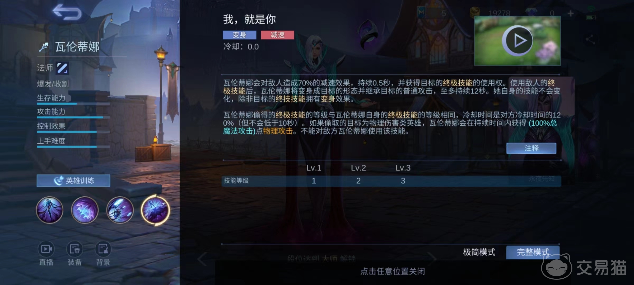 三技能对敌人造成高额减速并获得目标终极技能使用权,当使用偷来的技能后,瓦伦蒂娜将变身为目标形态,自身技能不会变化。偷来的技能和本身技能等级相同,冷却时间则比对手更长,如果偷去的目标是物理伤害类英雄,瓦伦蒂娜也会在大招持续时间内获得将魔法攻击100%转化成物理攻击的效果。