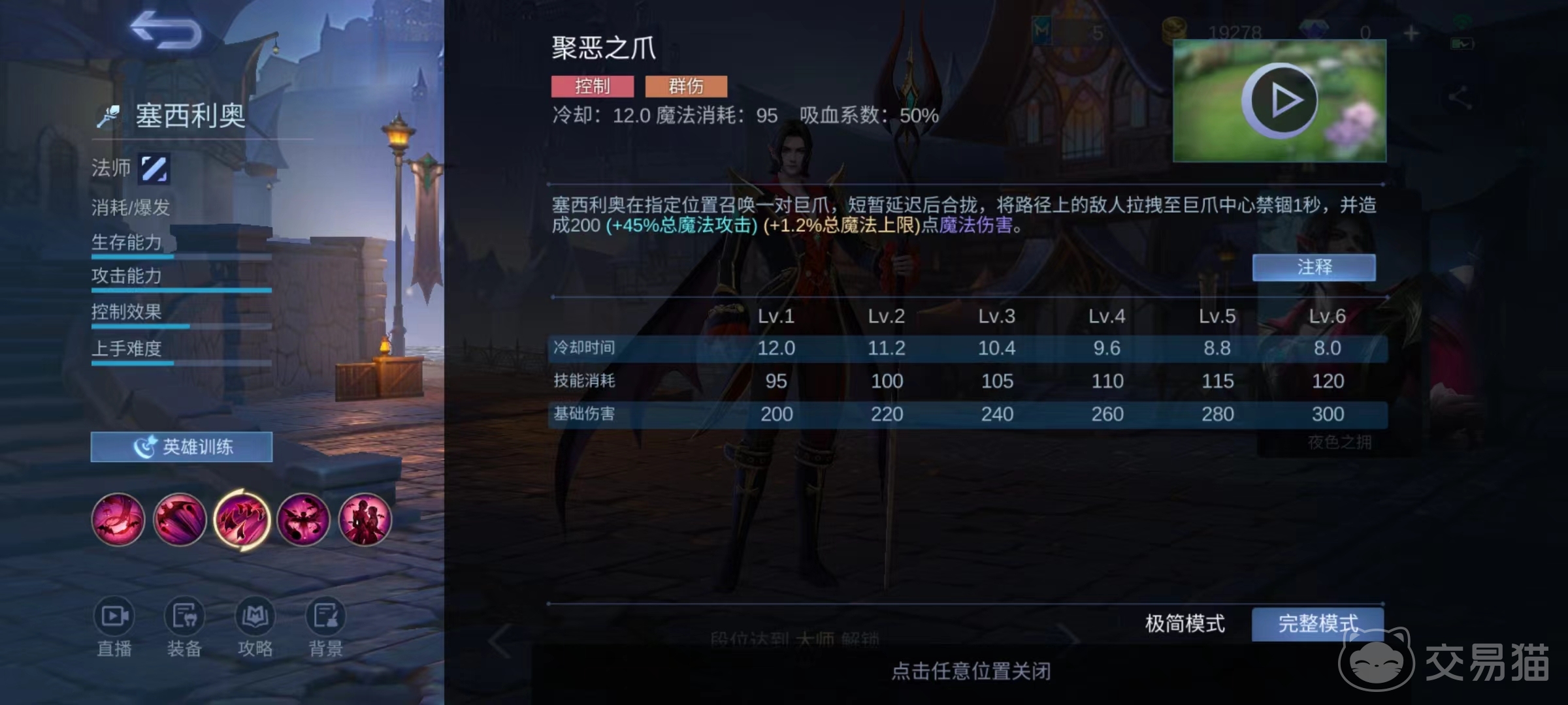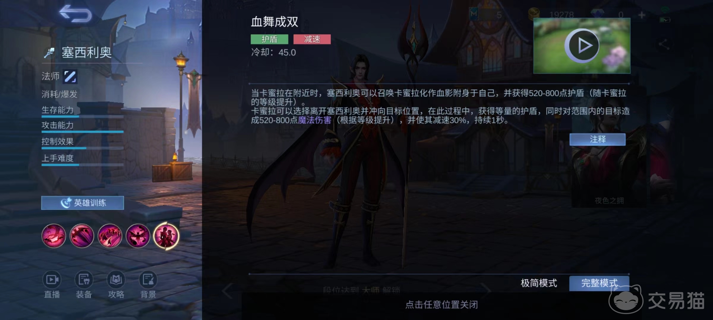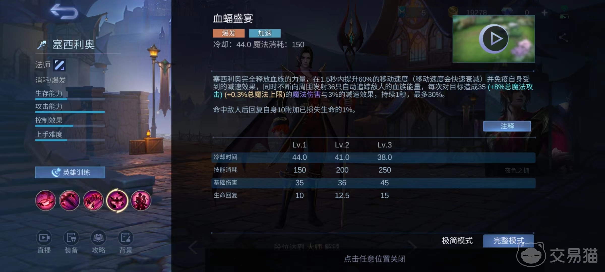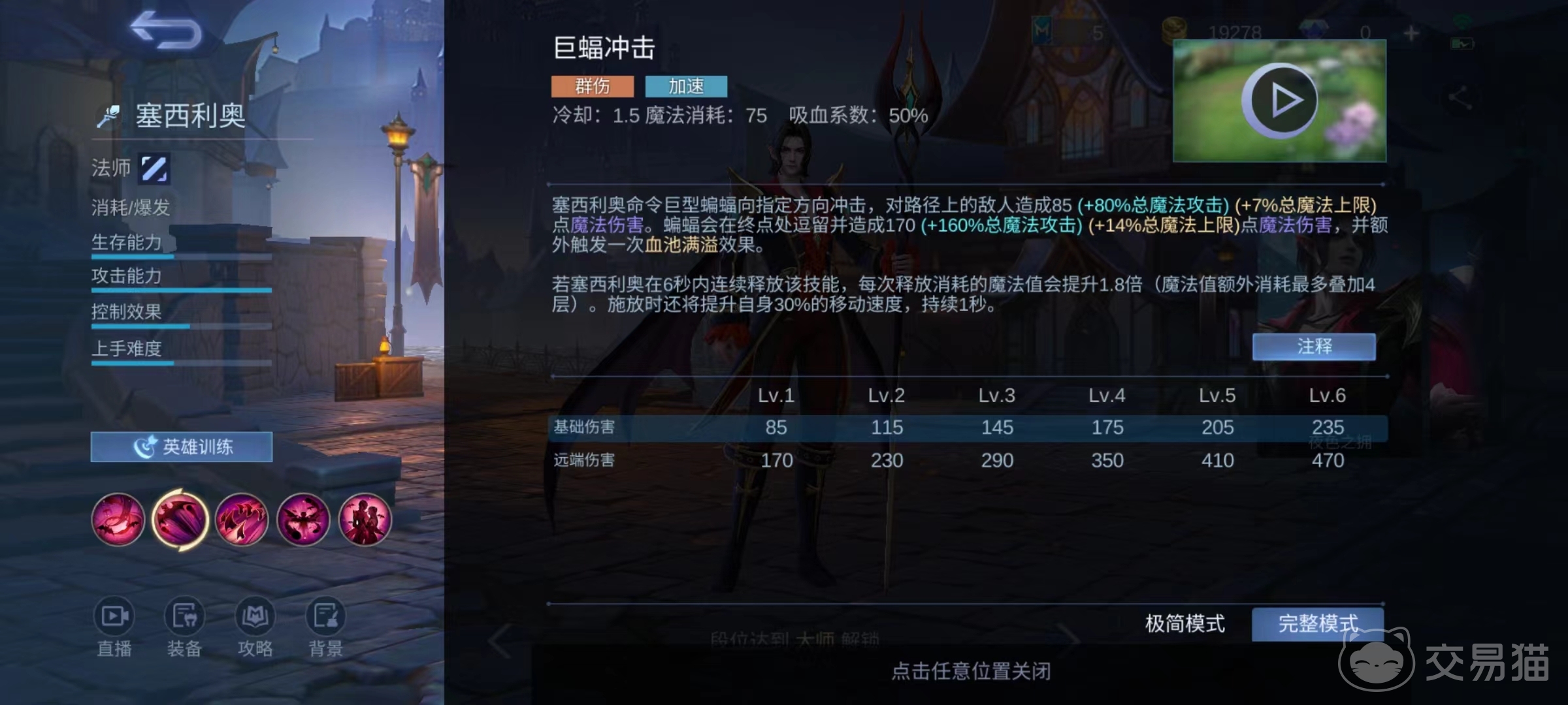 一技能召唤出巨型蝙蝠向指定方向冲击,对路径上的敌人造成魔法伤害,蝙蝠在到达终点处会逗留一段时间并触发被动效果。如果塞西利奥在6秒内连续释放该技能,消耗的魔法值会提升,在释放时还将提升自身的移动速度。该技能冷却时间非常短,这使得塞西利奥在线上拥有极强消耗能力,拥有被动所带来的魔法加成也不用怕续航的问题,现在线上很少有法师可以做到与该角色对攻。