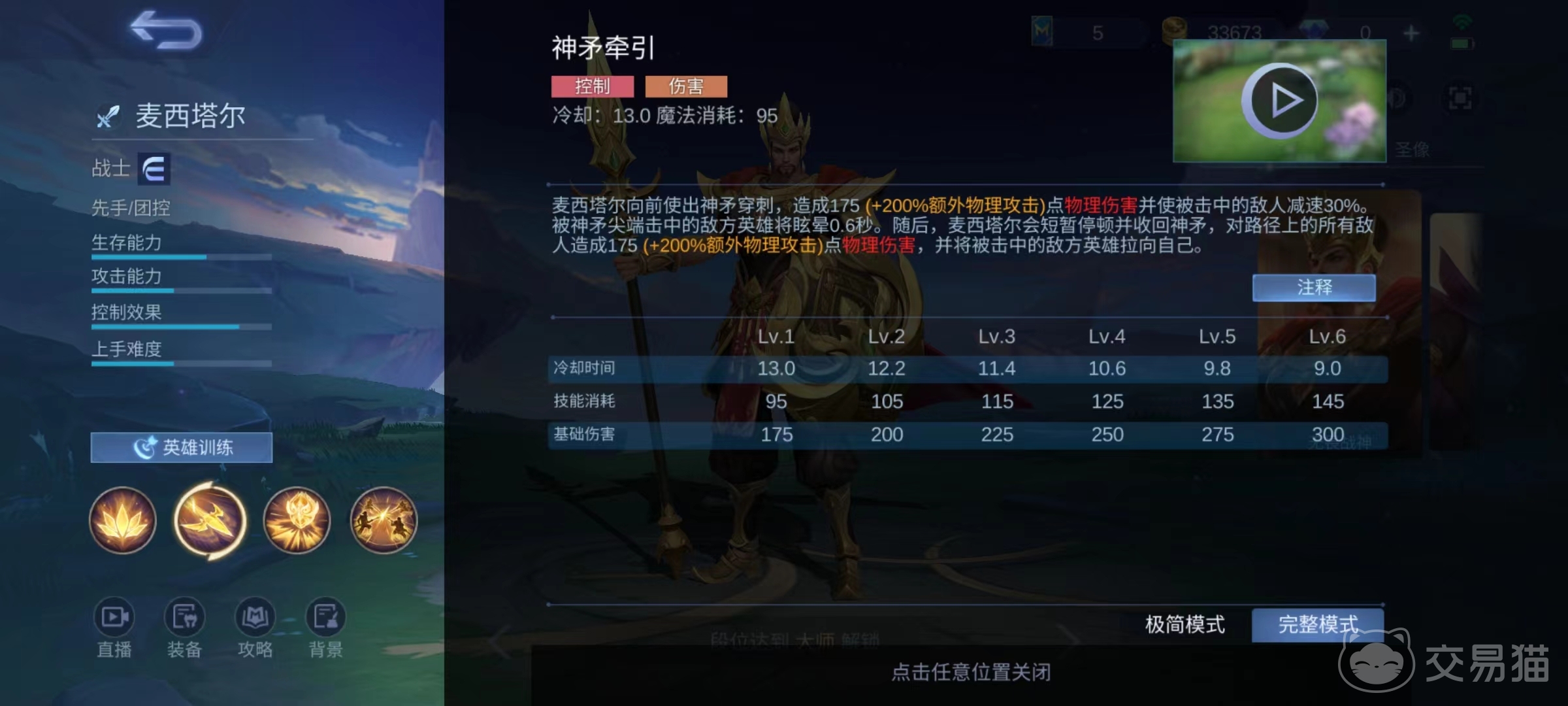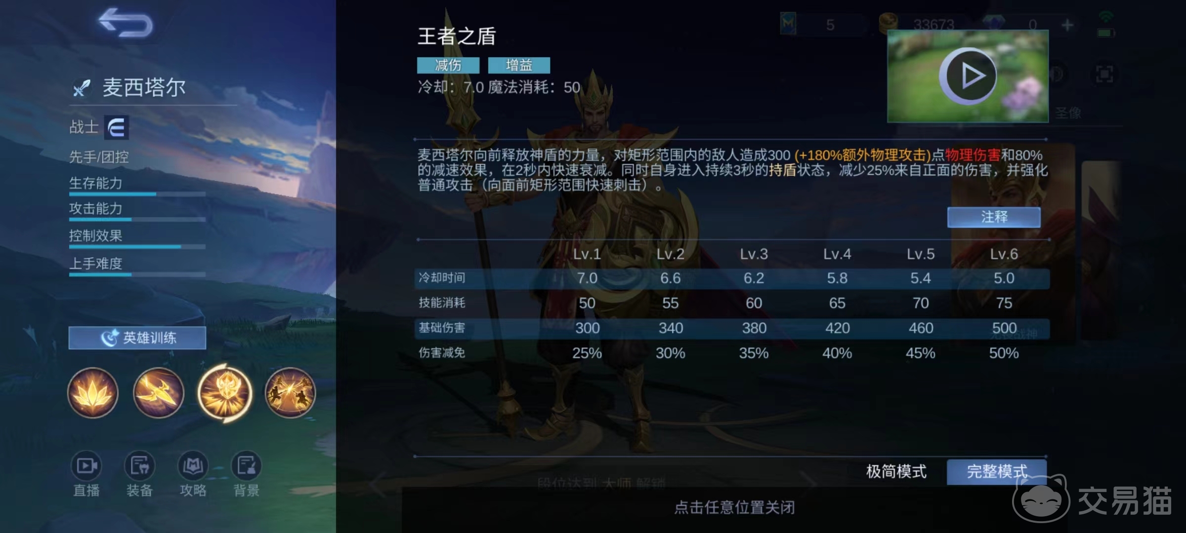 一技能将手中的长矛刺出造成伤害,并使敌人减速,如果被长矛尖端刺中,还将附加短暂眩晕。随后在短暂停顿后将长矛收回,对路径上的所有敌人造成物理伤害,还能将被击中的敌方英雄拉回自身所在位置。技能伤害范围比较长,大多数远程例如射手和法师都难以躲过此技能的伤害。二技能王者之盾,将神盾的力量释放出去,造成范围内物理伤害和减速,自身在接下来的三秒内处于持盾状态,受到来自正面的伤害减少,并强化普通攻击。注意只能减少来自正面的伤害,要及时调整自身的角度和朝向。