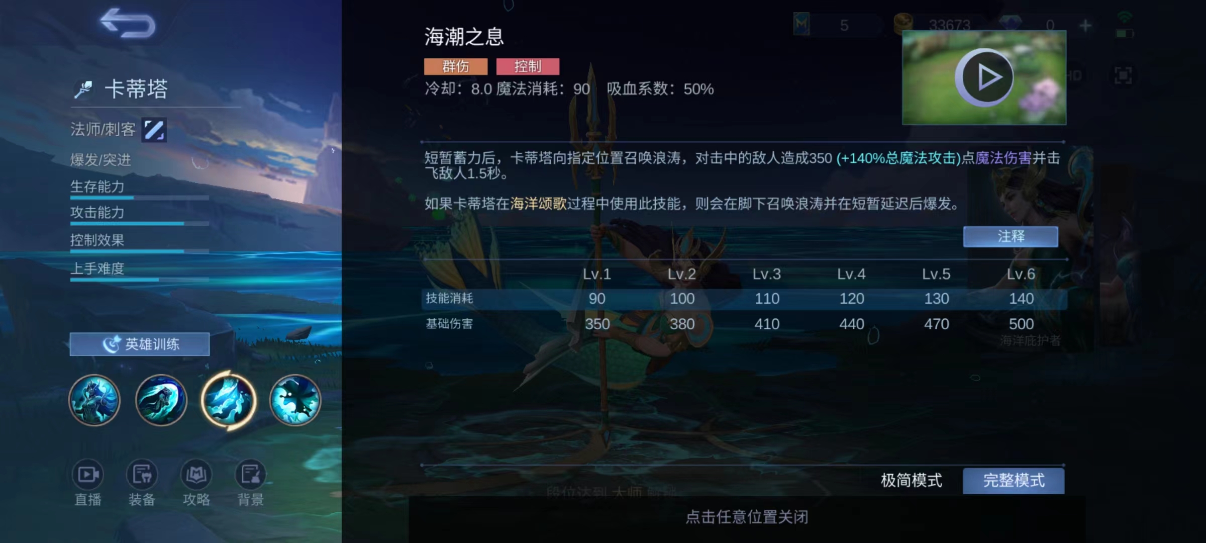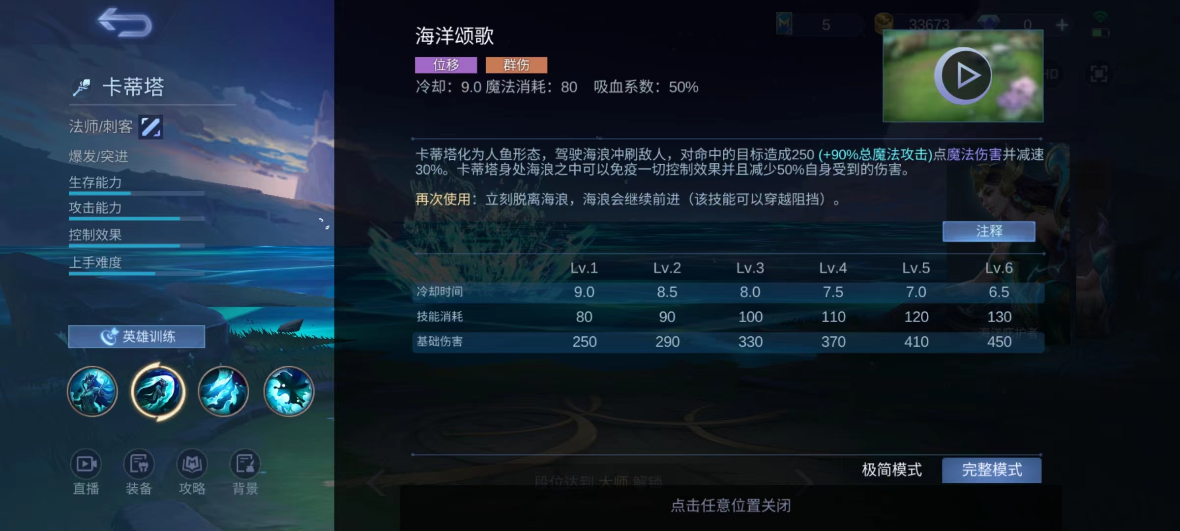卡蒂塔的被动每隔30秒钟就能获得海洋之力的庇护,受到伤害后的4秒内,会根据持续期间内受到的伤害恢复生命值,小兵和野怪的伤害不会触发该效果,这样的被动治疗可以让卡蒂塔在线上拥有消耗的实力。一技能海洋颂歌,化身为人鱼形态,驾驶海浪冲击敌人,命中后造成魔法伤害和减速。当处于海浪之中时自身免疫一切控制效果并降低受到的伤害,再次点击该技能可以立即脱离海浪,但海浪会继续往前移动。
