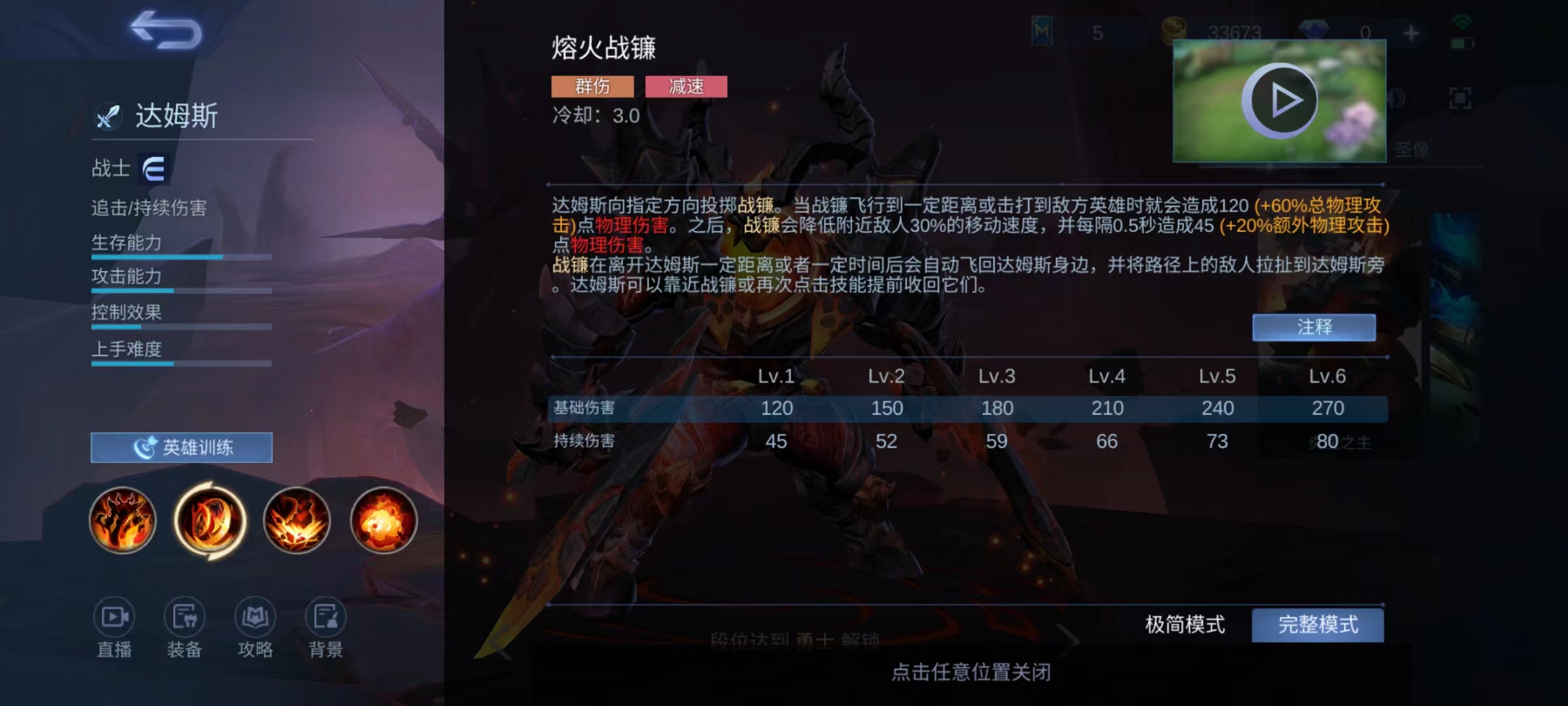 在被动技能的影响下,达姆斯拥有战镰时,每次攻击有几率在目标脚下生成熔岩能量,熔岩将会在短暂延迟后爆发造成真实伤害。如果手中没有战镰,则提高自身25%移动速度,将战镰重新拿回后,下一次普通攻击获得强化,除了伤害更高之外还能降低移动速度,并且必定触发熔岩能量。一技能熔火战镰,可以向指定方向将手中镰刀投掷出去,当飞行到一定距离或者命中敌方英雄时造成物理伤害,对附近敌人降低移动速度并持续产生输出。