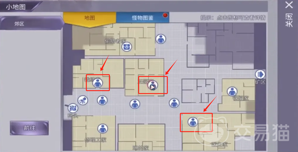 然后再看到郊区里面的布局,就能看到每个人上面都有自己的名称,可以选择工匠、裁缝或者医生,在他们那里都可以兑换到道具。