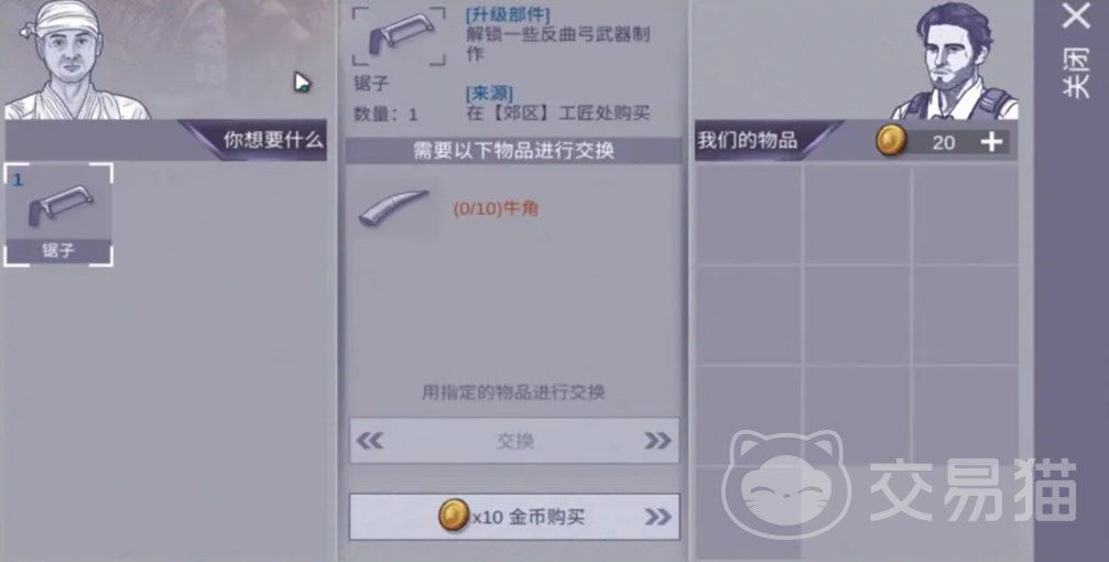 需要注意的是,在出门之前大家需要在背包里装上适当的物资用于交换,而且每一个商人羊角锤的价格可能会有不同,建议大家可以一个一个看一看,找比较便宜的完成交易。