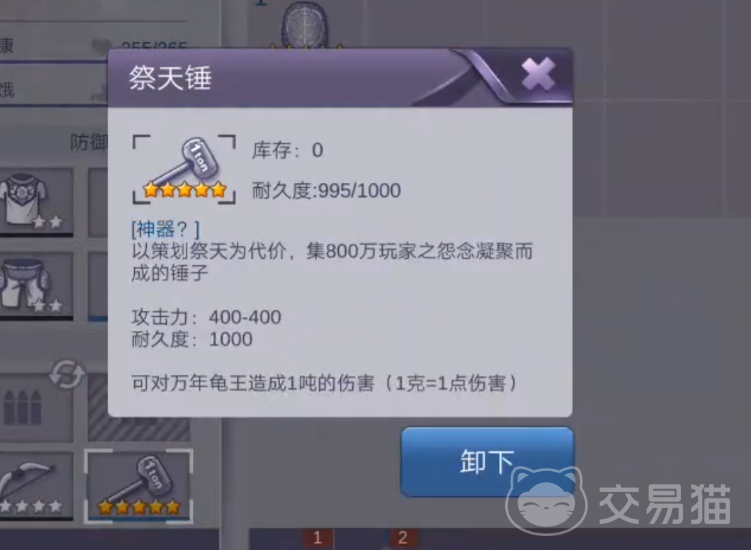还有一种快捷打败万年龟王的方式就是使用祭天锤,这把神器是专门用来敲万年龟王的龟壳的,蓄满力能对它造成一百万点暴击伤害。