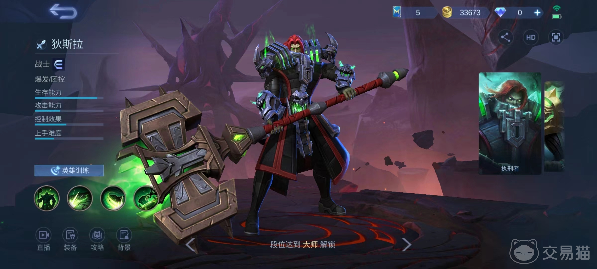 一技能复仇之击,向前方挥动大锤产生地裂,地裂会蔓延出去造成物理伤害,裂痕命中的第一个目标会钻入体内进行减速,同时增加自身移动速度,之后裂痕在目标身上爆炸,造成一次额外伤害。二技能行刑之击,向前方扇形范围内挥舞大锤连续攻击三次,在挥舞期间可以手动调整方向,每次攻击都会附带减速效果,如果输出目标是小兵则只有60%的伤害。三技能效果为跳跃到指定区域并造成范围伤害,之后将刑台召唤出来减速敌人,刑台会向范围内的敌方英雄伸出勾锁,每隔一段时间就会将目标进行拉扯。